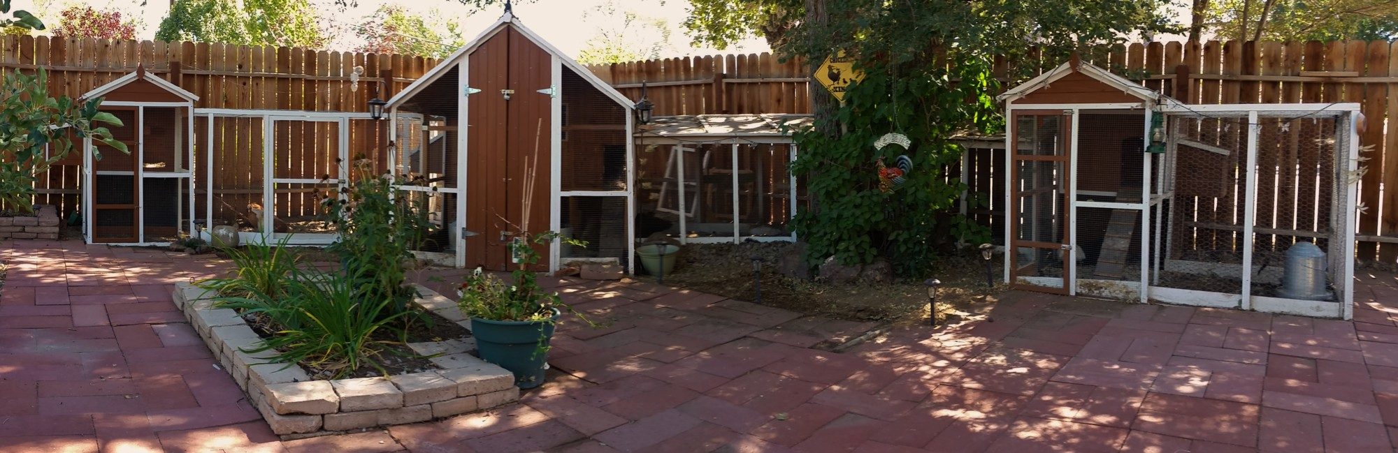 This is my "Chicken Condo" I got three chicken coop kits and attached them to each other with runs, the center run has a roof because it is mostly under a tree, too many leaves are not good for chicken diets. I had so much fun making this and now I have 8 Chickens and 3 pullets in it. 2 Black Copper Marans, 2 Golden Comets, 1 Welsummer, 1 Easter Egger, 1 Cockoo Marans, Right now I have my Blue Favaucana in the far left area with her 3 Ameraucana Chicks. 1 I can separate the two outer "huts." so that if I have a hen go broody I can let her sit and she will be protected from other hens bothering her. I just love this Coop and it is a wonderful addition to my Décor in the backyard. Here in Sparks Nevada we recently won a huge victory WE ARE LEGALLY ALLOWED TO HAVE BACKYARD CHICKENS!!!! The new ordinance passed 3 weeks ago. So I get to keep my beautiful coop and my babies whom I love so much.