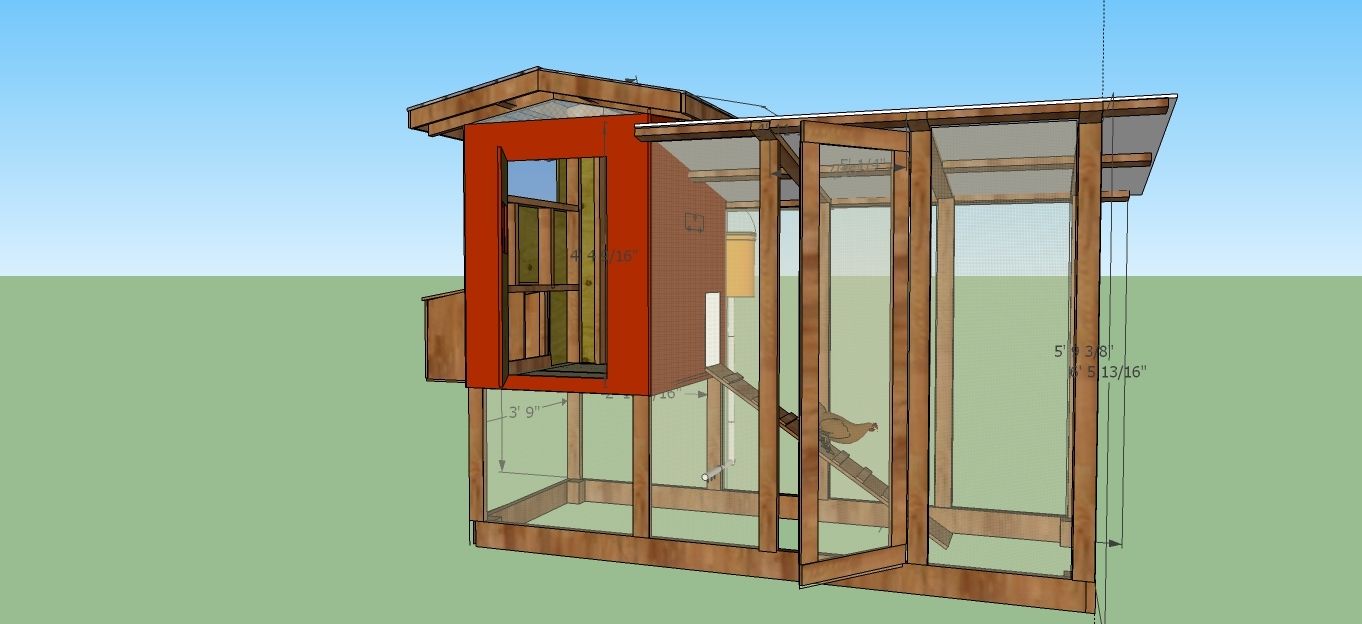 The link below directs to the coop design I made in google sketchup. the coop is 3x4 ft and 4.5 ft tall (raised off the ground), the run is 4x10 ft including the area under the coop. I plan on sinking 2 foot 4x4 posts a foot and a half into the ground at the corners of the structure and than attaching 2x6 on edge along the entire perimeter to provide foundation/structure and to hold in whatever type of litter/fill I settle on...leaning towards sand. I will bury hardware cloth at least 1 foot deep around the edge and may bury some coated metal fencing along the run floor even with or slightly lower than the 2x6's so that it will be at least 6 inches below the surface. I am planning on having a removable coop floor of 1/2" plywood covered with vinyl. Also not shown in the model is plywood on the interior walls which I plan to paint for easy cleaning and mite prevention. I know that I could simplify the framing and make it generally less beefy, but I want to build it to last.