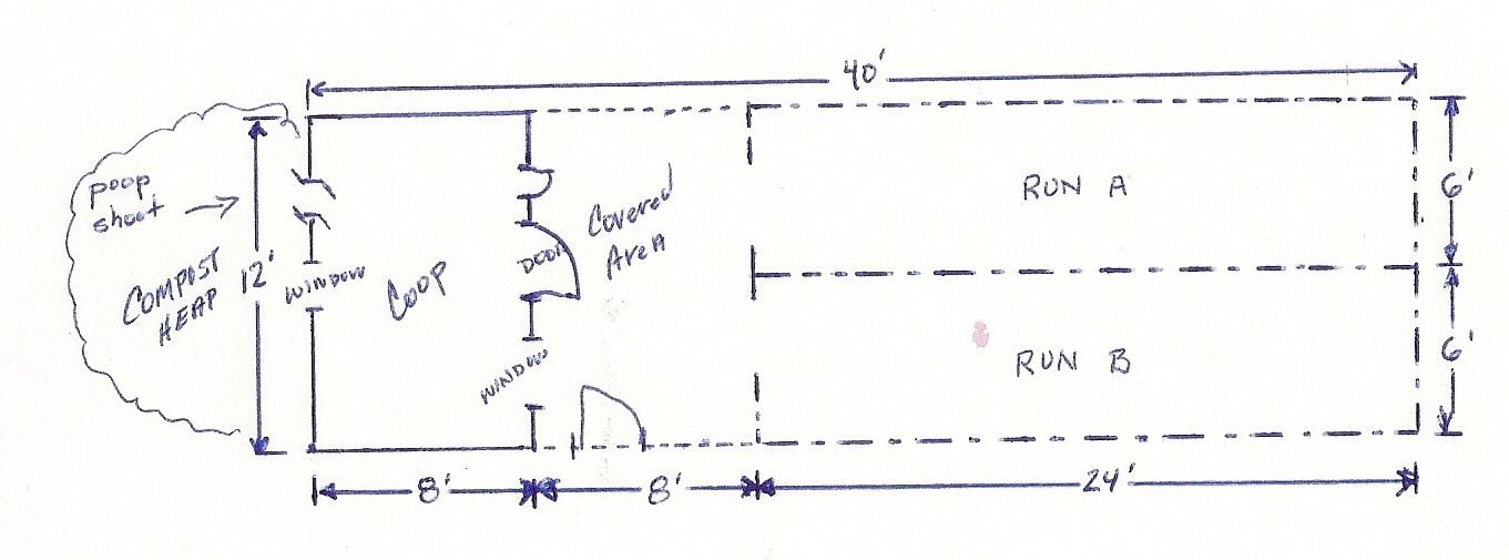 Oh, guess I should say, our yard is on a hill so the coop will be built up about 1/2 ft and the compost pile is on the down side of the hill and the runs are actually on the same level as the coop ( the only level spot in the yard!) When it rains the runoff will be able to run under the coop. There will be steps up to the human door and the chicken door will have a ramp.
