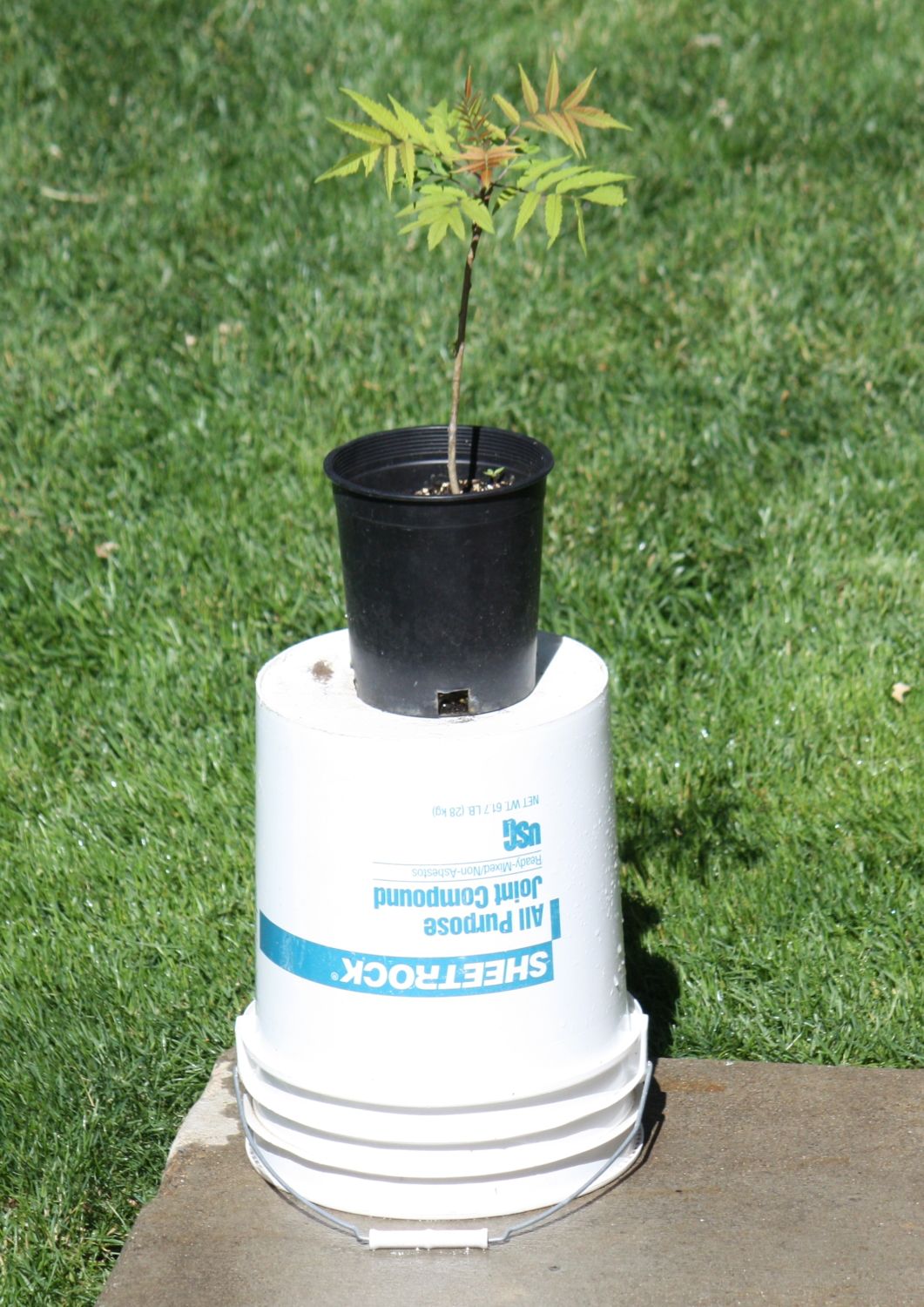 I found this Elk Horn Sumac seedling growing in my backyard this spring so I thought that I would transplant it to a better location. I potted it up but the pullets and the ducks kept stripping the fresh growth from it. So I put it on a 5 gallon bucket and hoped for the best. Well now after a few weeks and some good growth, I think that this poor little seedling just might make it.