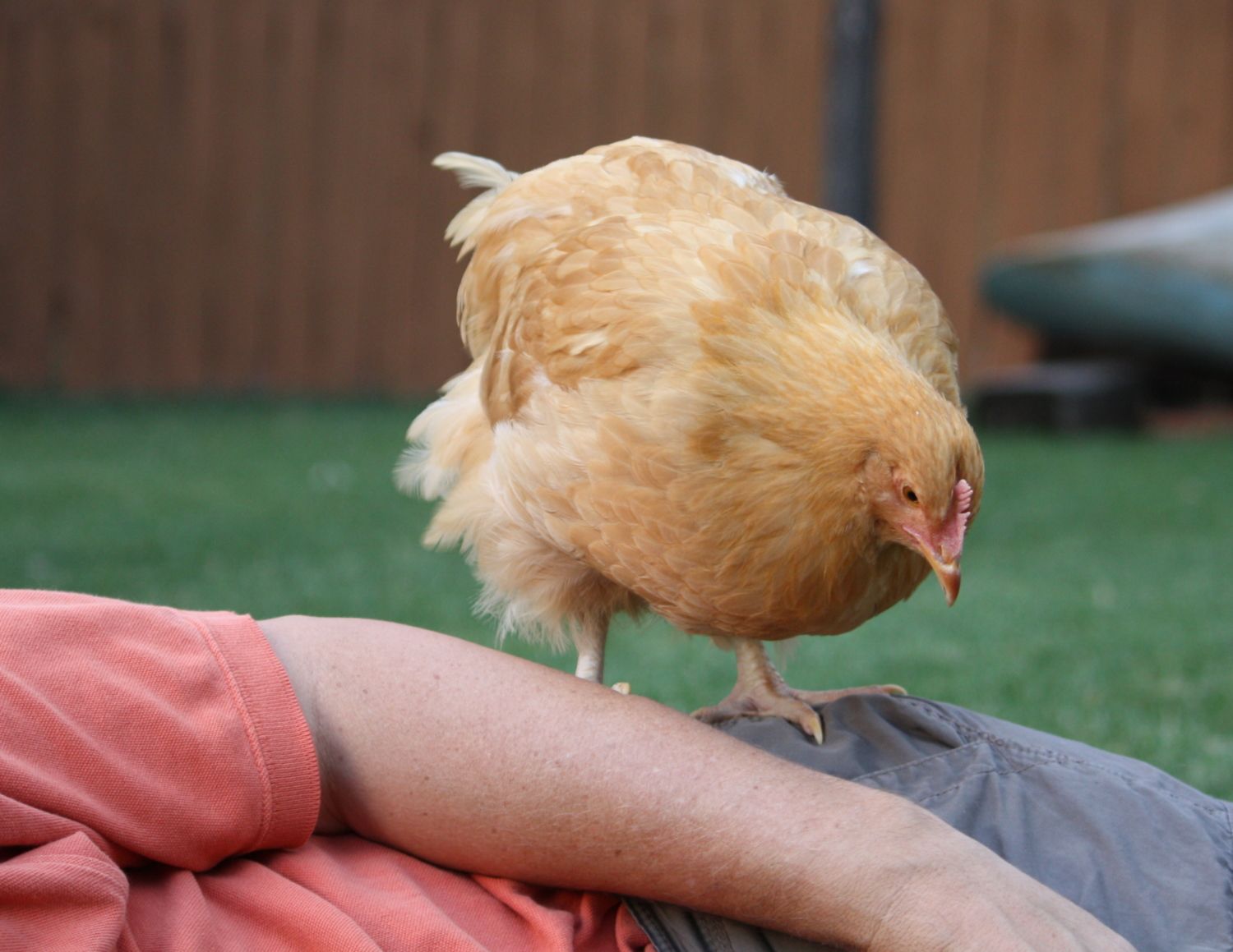 ChaCha has been my wife's favorite pullet in the flock for sometime now. Making friends with a pullet is much safer than a ROO...I knew that I should have listened to my wife. ChaCha has a memorable personality. Whenever we are in the yard, she is near us clucking contentedly. She is very friendly and genuinely enjoys people. She eats up the attention that we give her. ChaCha likes to be touched, but she doesn't really like being held. She will growl whenever I pick her up.