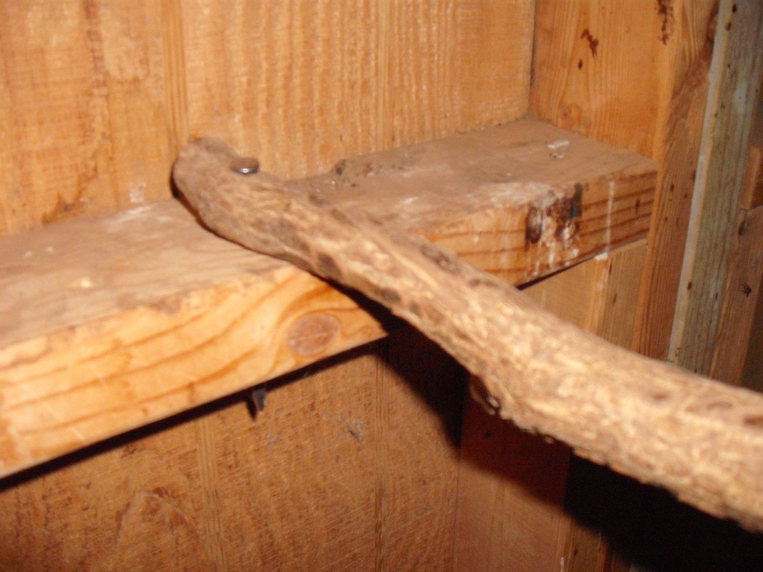 Here’s one version of my main roosts. I normally go with two tree branches but I was down to a small flock at this time. My juvenile roost is a 2x4 on edge. You can get an idea of how their feet wrap around a round roost and maybe a rough idea of size. Maybe that close-up shot will give you an idea of the diameter part of the narrow part.