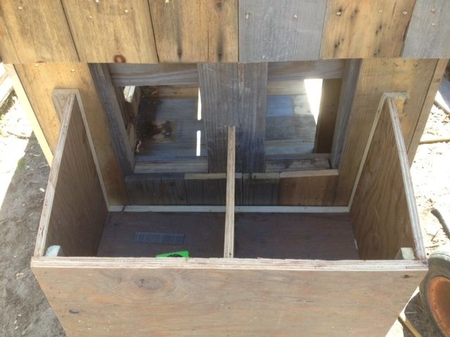 We trimmed the center board to give the girls a bit more wider "doors" to hop into the nesting boxes, and got the roof for the nesting box cut to size. In lieu of metal hinges, we'll be using a 4-inch wide piece of engine belt that will act as the a water-proof "hinge" to allow us access to the boxes (didn't get a shot of that).