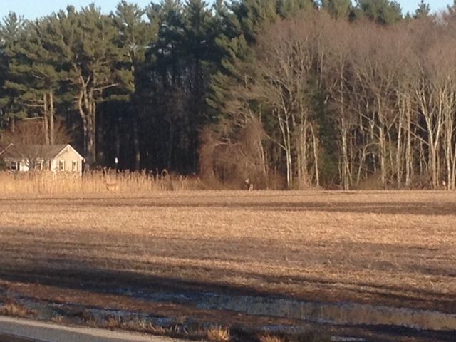 The coop is being built at my folks house over the border into MA...was up there pretty much all day and outside most of that time. Got to see nature while we worked....in the morning, two good sized hawks were shopping for snacks in the field across the street (sorry hawks, this chicken coop isn't getting filled with chickens in YOUR neighborhood). Throughout the day, Canadian Geese flying north honked overhead. Then, just as we were wrapping up for the day, a couple of deer wandered out of the woods to check our progress: