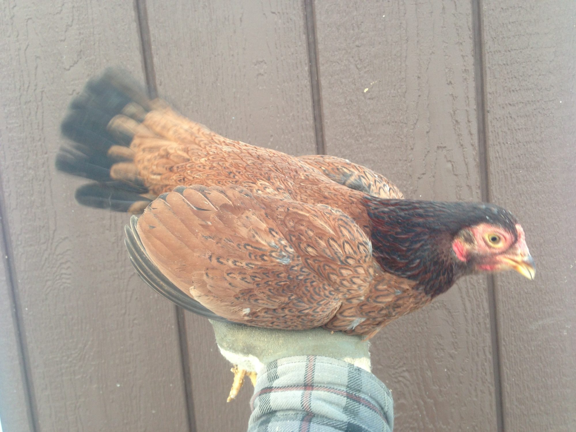 This is a red laced black Cornish bantam that I got out of my birds. She isn't great type but hope to breed her in the future to improve it.