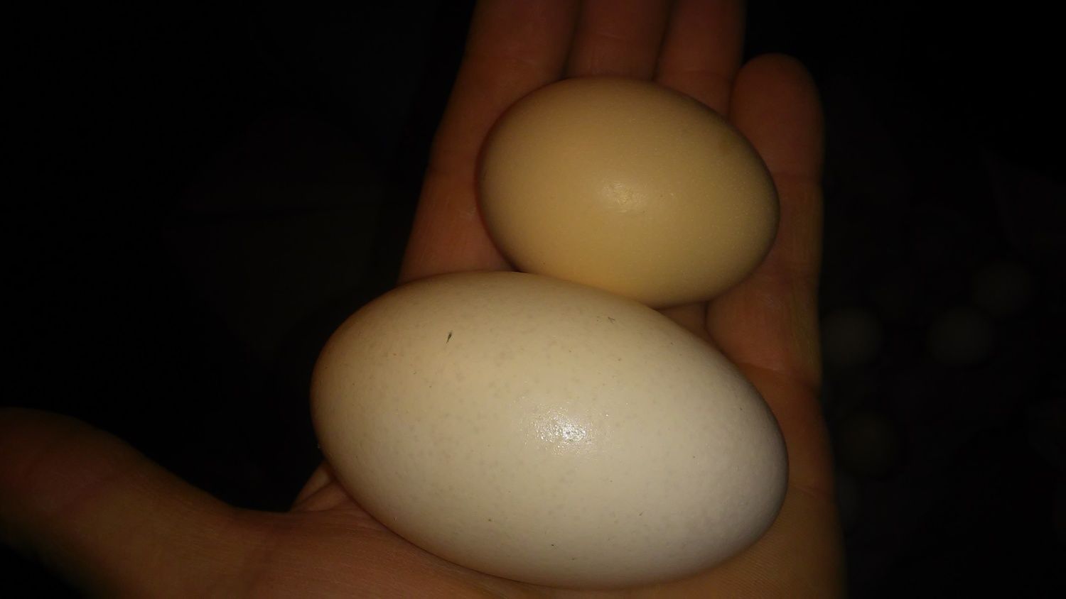 I know her eggs are the same size as my big dark Cornish hens.