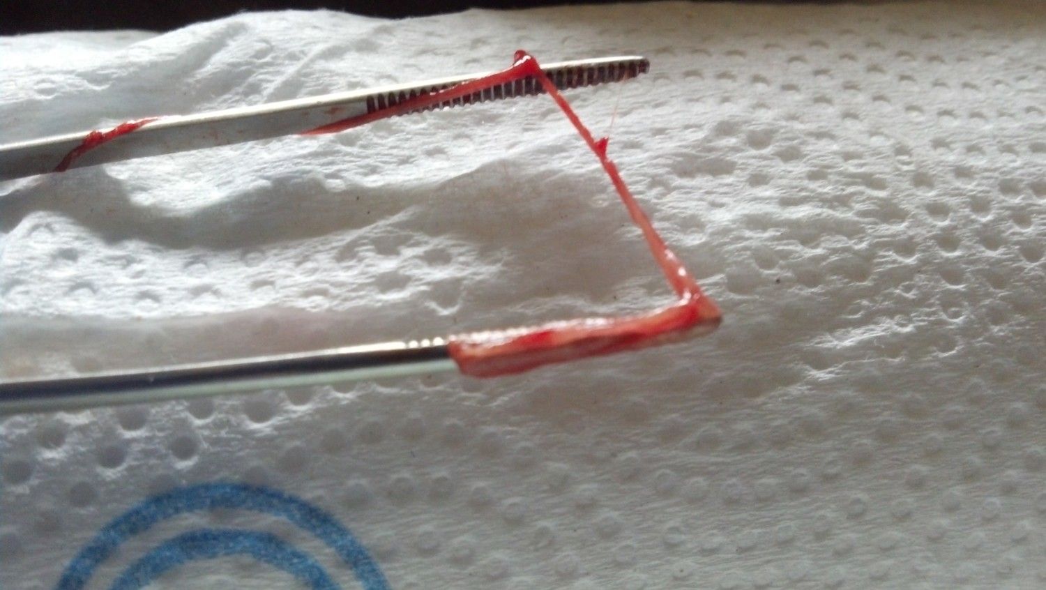 These are photos of a section of oviduct removed from a 14 week old pullet. The tine of this forcep is less than 2mm in diameter, and is running through the oviduct, which shows you how small it is and how thin-walled it is since you can see through it.