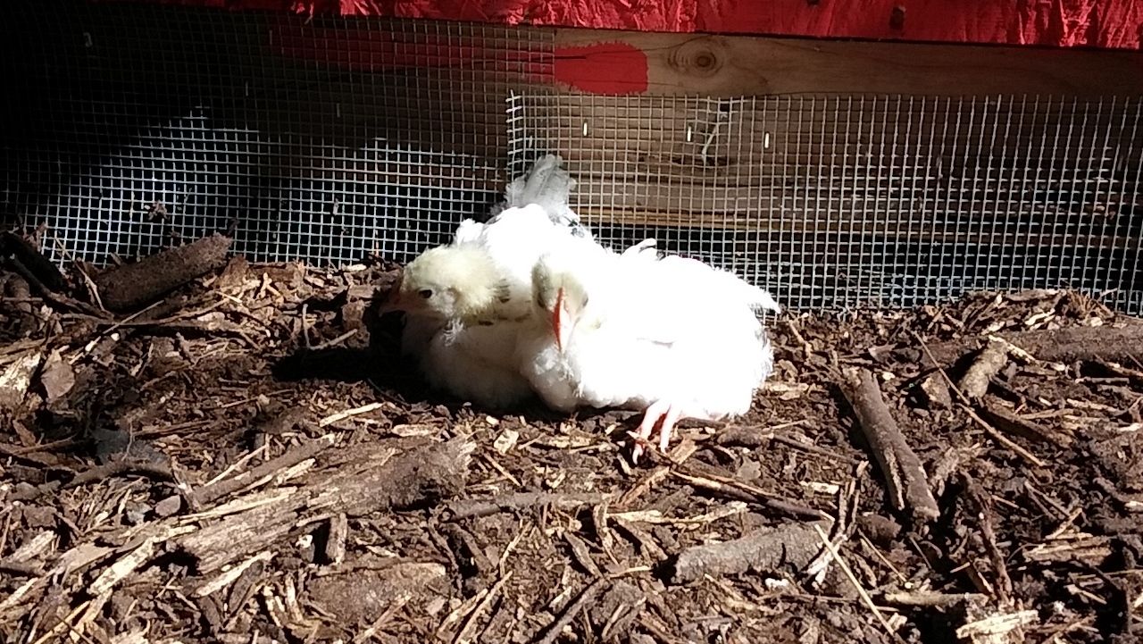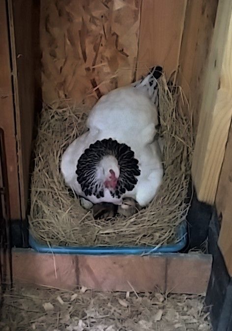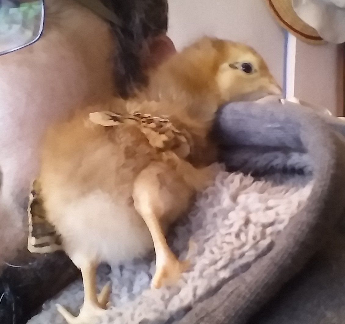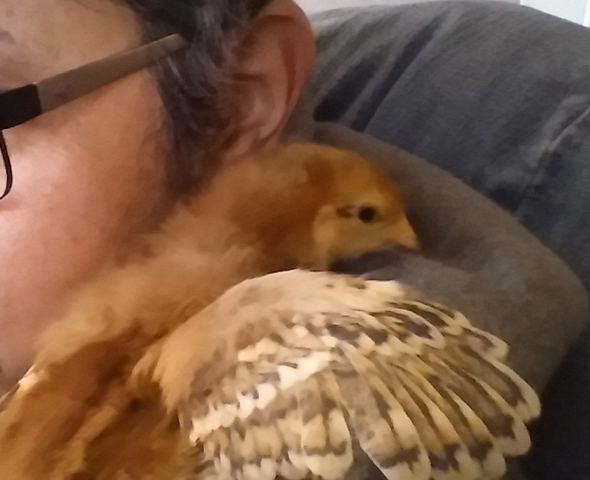 That weekend , 6 weeks and 2 days ago, we picked up 6 cream legbar eggs from him. All 6 hatched, way to go Jeanie you sat on them like a champ! Since they auto sex, we pick out 2 little baby hens to keep and the rest went to a friend that lives around the corner and down the road a look see. Our 2 bitty hens are Boo (she's brave) and Poppin. Poppin's got a lot to say. Ok actually she complains...a lot. Like it's a hobby.