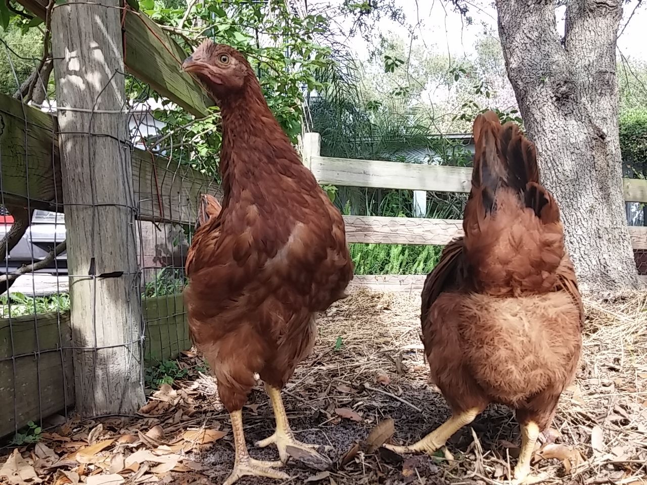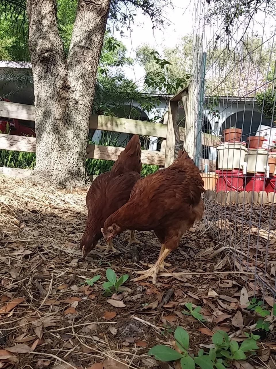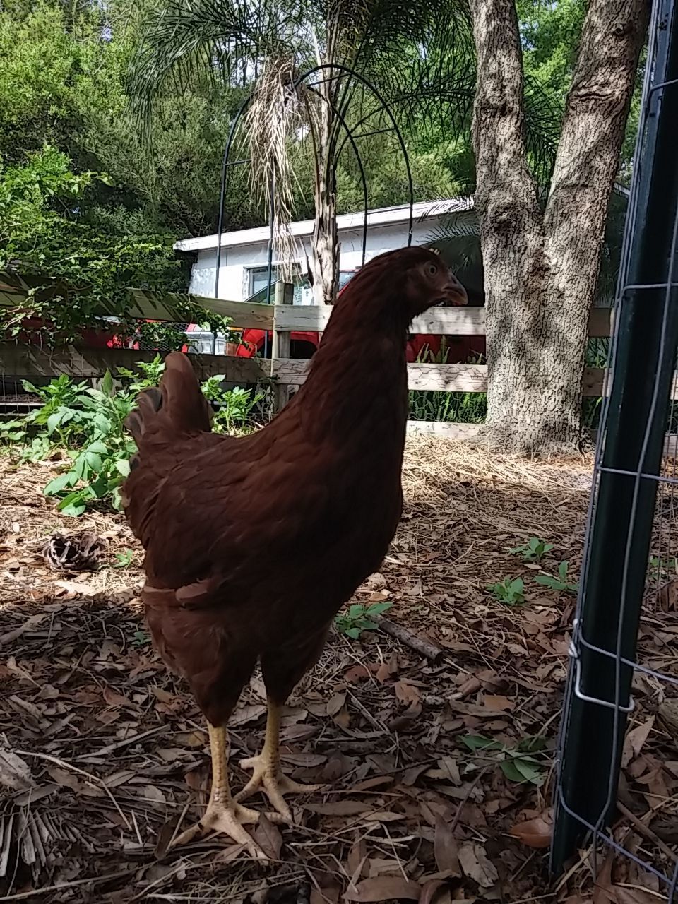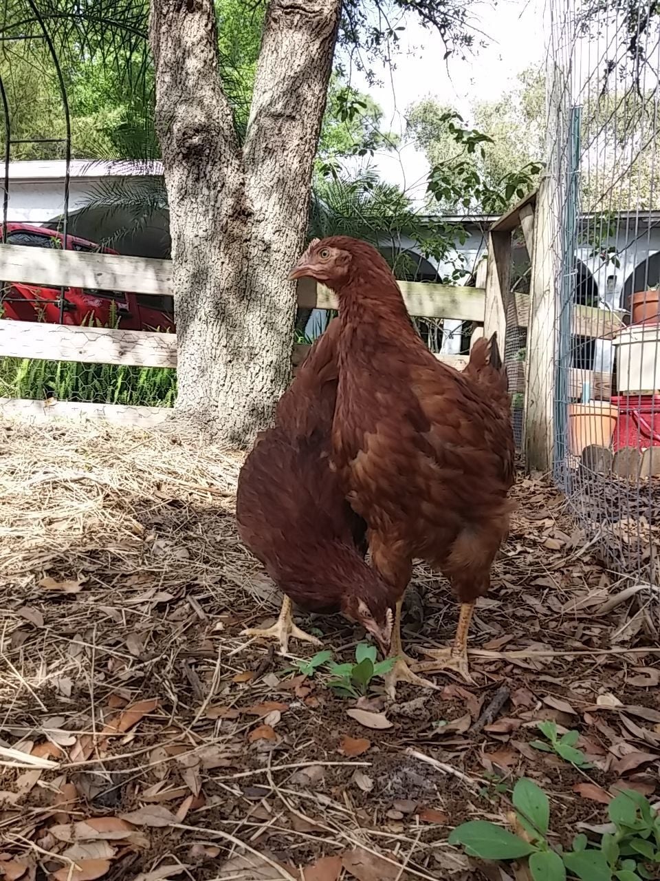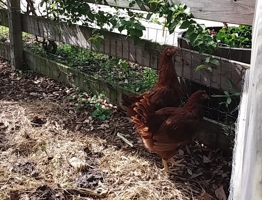 That was some time back now. Since then, wife said they'd like more room so the fence for their yard area when we let the out of the enclosed coop...was...moved...twice. UHHHHHH! Guess she speaks chicken cuz they seemed happy enough to me with what I started them out with for "get out and stretch your legs" area but hey...what momma wants, mamma gets, then everybody's happy. Norma and Marilyn were found out to be Norm and Marlin. We gave them both to our breeder friend, happy to do so because his light sussex roo couldn't mate anymore and he know a young man that was looking for a buff orpington roo. So good homes for both. Then we lost little Tippy Hendren. Poor little Henny. She was my favorite and was a character and she's still missed to the point I accidentally call Jean Tippy sometimes. That left Jean all by her self. She didn't take to that and seemed to mope around so we started researching what to get. This time we were going to pick from among the auto sexing so we wouldn't have baby roos again. Being stuck in town, we're not allowed roos. Wouldn't you know it though...wifey went to the feed store with me and I walked out with a bag of chick feed and she...well...she walked out with a pair of RIR chicks. Jeanie never really took to them though..funny, that. Kind of stand offish to them, realy. Maybe cuz they're yankees? They're names are Scarlet and Lucy but mostly we call them the Twins cuz the're attached at the hip. Then one day Jeanie wouldn't get up off her nest. Which quickly got me to worrying because there wasn't egg laying going on, I had already got her egg a couple hours earlier. We just lost Tippy not to long ago now what? She's not getting up, I took her out and set her down on the pallet boardwalk and she just sat there with this look on her face. Like she wasn't checked in. Those of you that know, you know. But I didn't know so I freaked a little. She didn't eat that day, and didn't show interest in anything but sitting in her nest the following day so I had wifey call our breeder friend. Told him all her "symptoms" and what could it be what could it be?