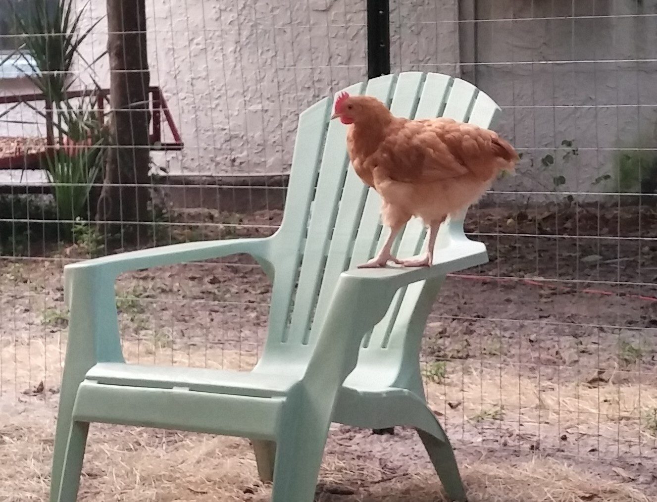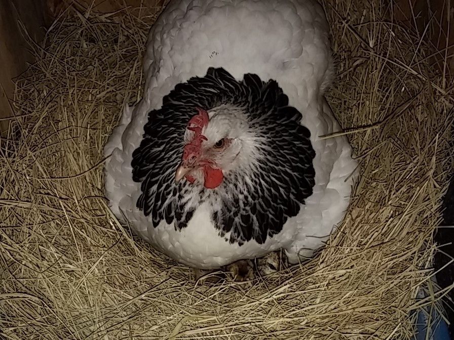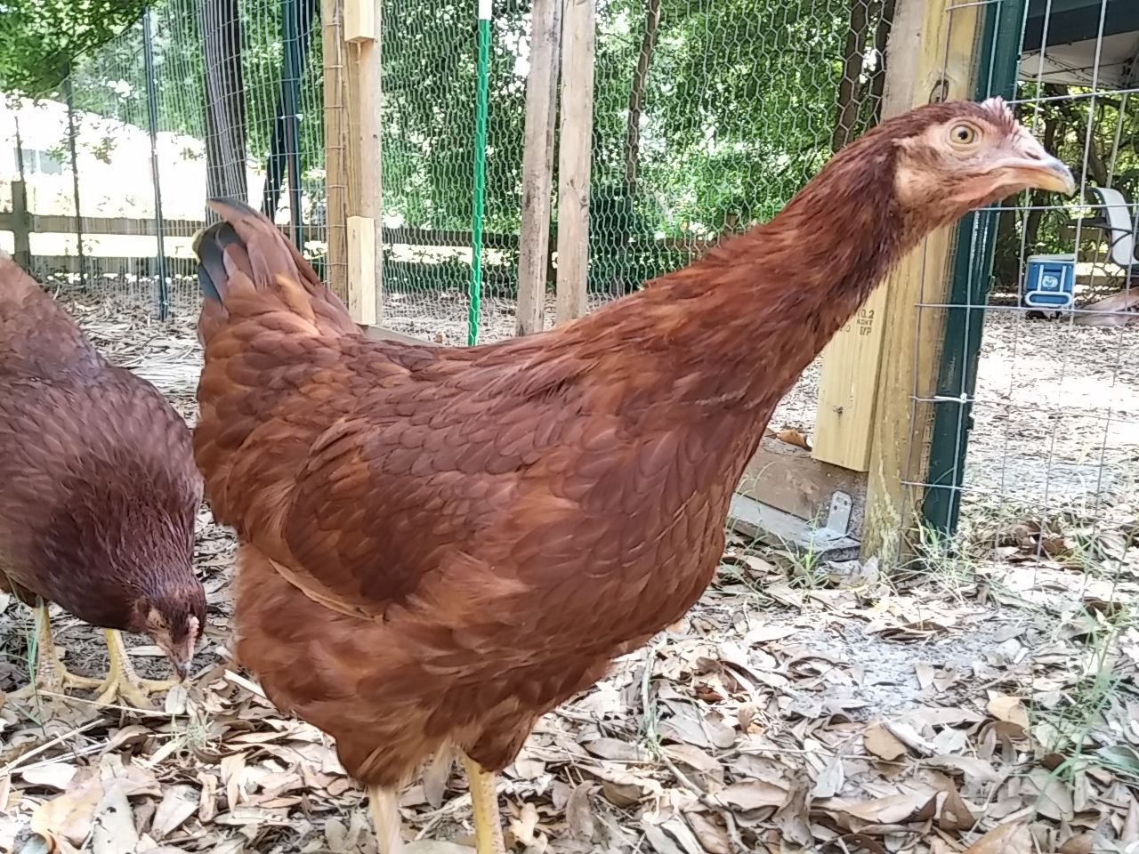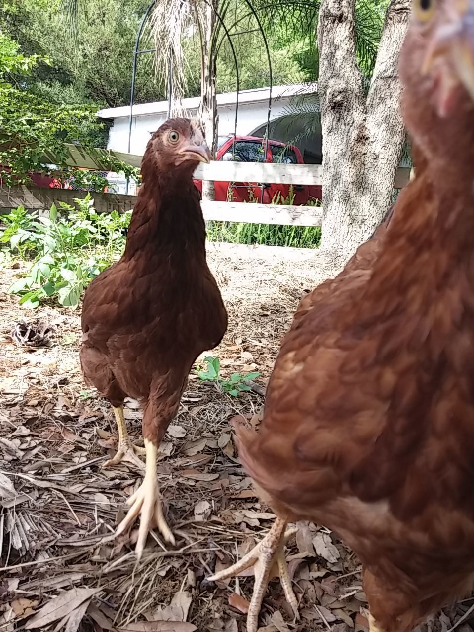 That was some time back now. Since then, wife said they'd like more room so the fence for their yard area when we let the out of the enclosed coop...was...moved...twice. UHHHHHH! Guess she speaks chicken cuz they seemed happy enough to me with what I started them out with for "get out and stretch your legs" area but hey...what momma wants, mamma gets, then everybody's happy. Norma and Marilyn were found out to be Norm and Marlin. We gave them both to our breeder friend, happy to do so because his light sussex roo couldn't mate anymore and he know a young man that was looking for a buff orpington roo. So good homes for both. Then we lost little Tippy Hendren. Poor little Henny. She was my favorite and was a character and she's still missed to the point I accidentally call Jean Tippy sometimes. That left Jean all by her self. She didn't take to that and seemed to mope around so we started researching what to get. This time we were going to pick from among the auto sexing so we wouldn't have baby roos again. Being stuck in town, we're not allowed roos. Wouldn't you know it though...wifey went to the feed store with me and I walked out with a bag of chick feed and she...well...she walked out with a pair of RIR chicks. Jeanie never really took to them though..funny, that. Kind of stand offish to them, realy. Maybe cuz they're yankees? They're names are Scarlet and Lucy but mostly we call them the Twins cuz the're attached at the hip. Then one day Jeanie wouldn't get up off her nest. Which quickly got me to worrying because there wasn't egg laying going on, I had already got her egg a couple hours earlier. We just lost Tippy not to long ago now what? She's not getting up, I took her out and set her down on the pallet boardwalk and she just sat there with this look on her face. Like she wasn't checked in. Those of you that know, you know. But I didn't know so I freaked a little. She didn't eat that day, and didn't show interest in anything but sitting in her nest the following day so I had wifey call our breeder friend. Told him all her "symptoms" and what could it be what could it be?