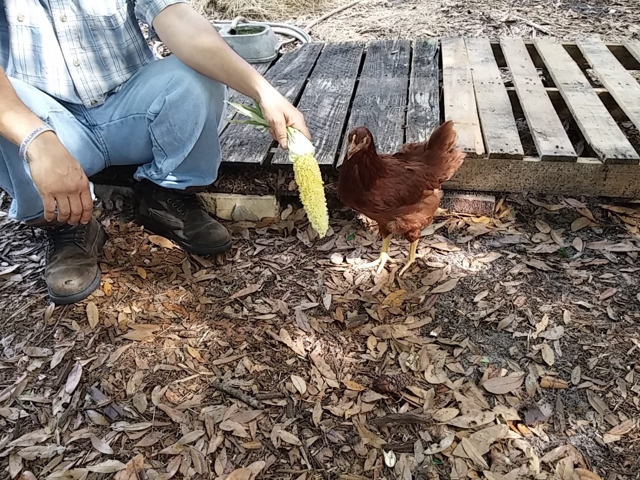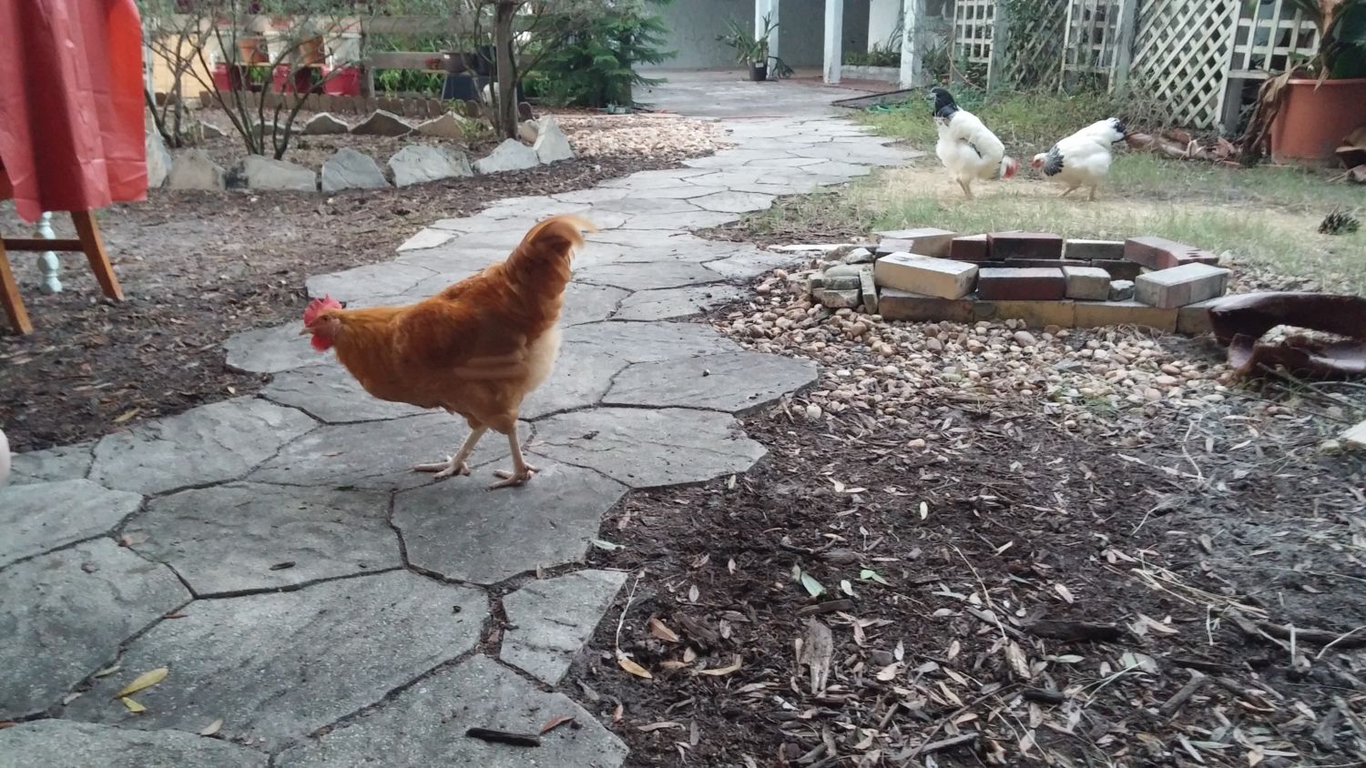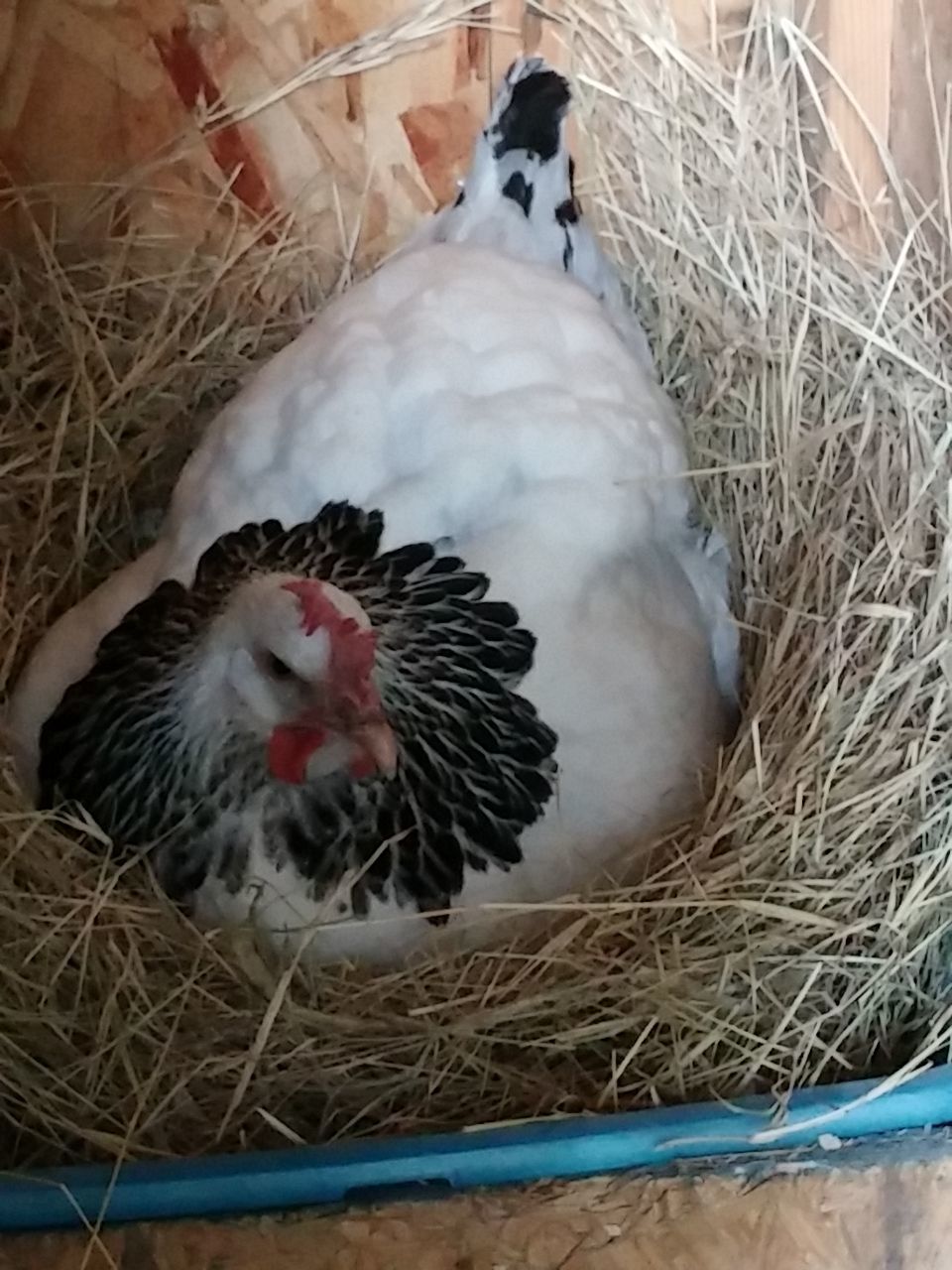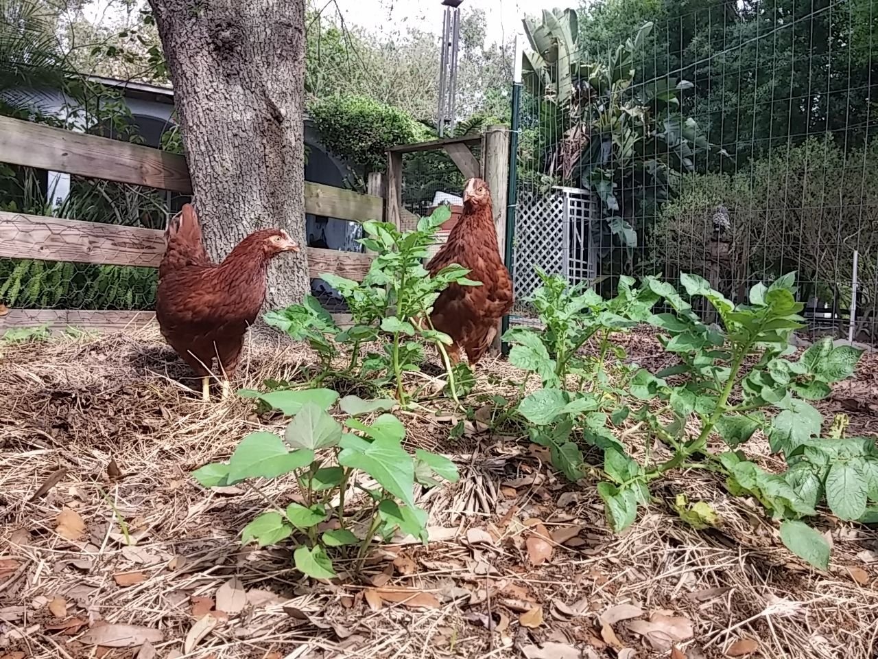 That was some time back now. Since then, wife said they'd like more room so the fence for their yard area when we let the out of the enclosed coop...was...moved...twice. UHHHHHH! Guess she speaks chicken cuz they seemed happy enough to me with what I started them out with for "get out and stretch your legs" area but hey...what momma wants, mamma gets, then everybody's happy. Norma and Marilyn were found out to be Norm and Marlin. We gave them both to our breeder friend, happy to do so because his light sussex roo couldn't mate anymore and he know a young man that was looking for a buff orpington roo. So good homes for both. Then we lost little Tippy Hendren. Poor little Henny. She was my favorite and was a character and she's still missed to the point I accidentally call Jean Tippy sometimes. That left Jean all by her self. She didn't take to that and seemed to mope around so we started researching what to get. This time we were going to pick from among the auto sexing so we wouldn't have baby roos again. Being stuck in town, we're not allowed roos. Wouldn't you know it though...wifey went to the feed store with me and I walked out with a bag of chick feed and she...well...she walked out with a pair of RIR chicks. Jeanie never really took to them though..funny, that. Kind of stand offish to them, realy. Maybe cuz they're yankees? They're names are Scarlet and Lucy but mostly we call them the Twins cuz the're attached at the hip. Then one day Jeanie wouldn't get up off her nest. Which quickly got me to worrying because there wasn't egg laying going on, I had already got her egg a couple hours earlier. We just lost Tippy not to long ago now what? She's not getting up, I took her out and set her down on the pallet boardwalk and she just sat there with this look on her face. Like she wasn't checked in. Those of you that know, you know. But I didn't know so I freaked a little. She didn't eat that day, and didn't show interest in anything but sitting in her nest the following day so I had wifey call our breeder friend. Told him all her "symptoms" and what could it be what could it be?