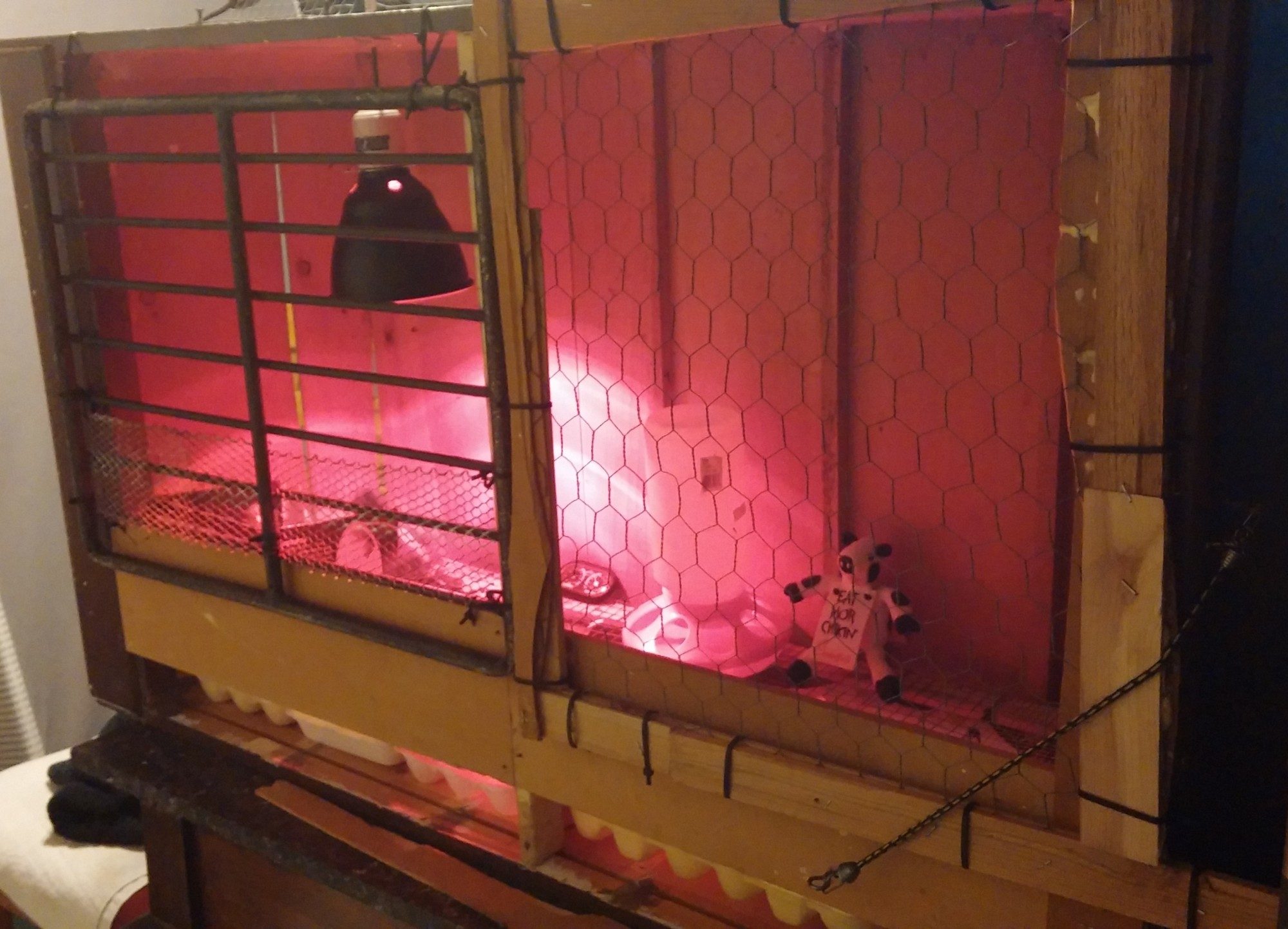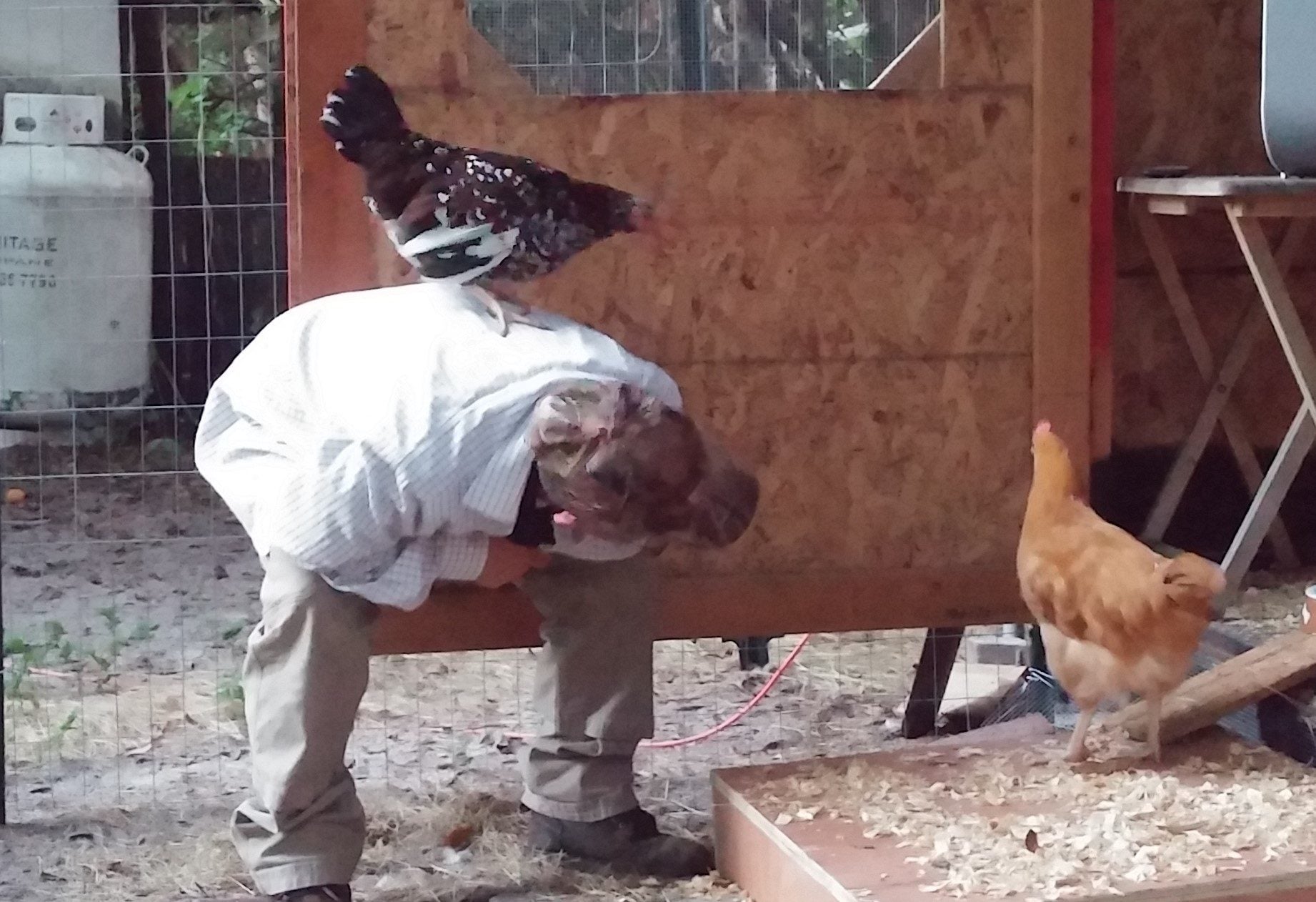 I coulda kissed him. So for yall that know me you know how we moved this thing into place. Those that don't Hi, we moved that monster by way of my wife and daughter laying down 3 panels of plywood, leap frogged over and over as a sort of redneck styled pathway, while my son pushed and I pulled with all our might but no to fast cuz it wobbled a little to and fro and though I love him, the boy come close to rolling me under and turning me into a greasy spot in the yard, and stop catch your breath, now PULL!!! PUSH!!! l LEFT! GO TO THE LEFT STOP!!! Back it up, now PUUUUUUUUSH!! Almost there...STOP! The panel, Babe, get the panel over here! I said stop! Wait for the panel! Watch my foot watch my foot! Get out ot the way Push Push Push...THERE! WHEW! We got it 100 and some odd feet to where it now sits and will stay AMEN! The rest of the story is sort of dull in comparison to the move. Heh. Just cut and nailed, and stapled and dug, you know, a typical hen house and enclosure dealio. End product we called the chicken mansion because it is HUGE. Spacious enough friends say when I get myself in the dog house with the wife, I could stay in the hen house real comfortable like, no problem! And I wouldn't have far to moved for breakfast neither!