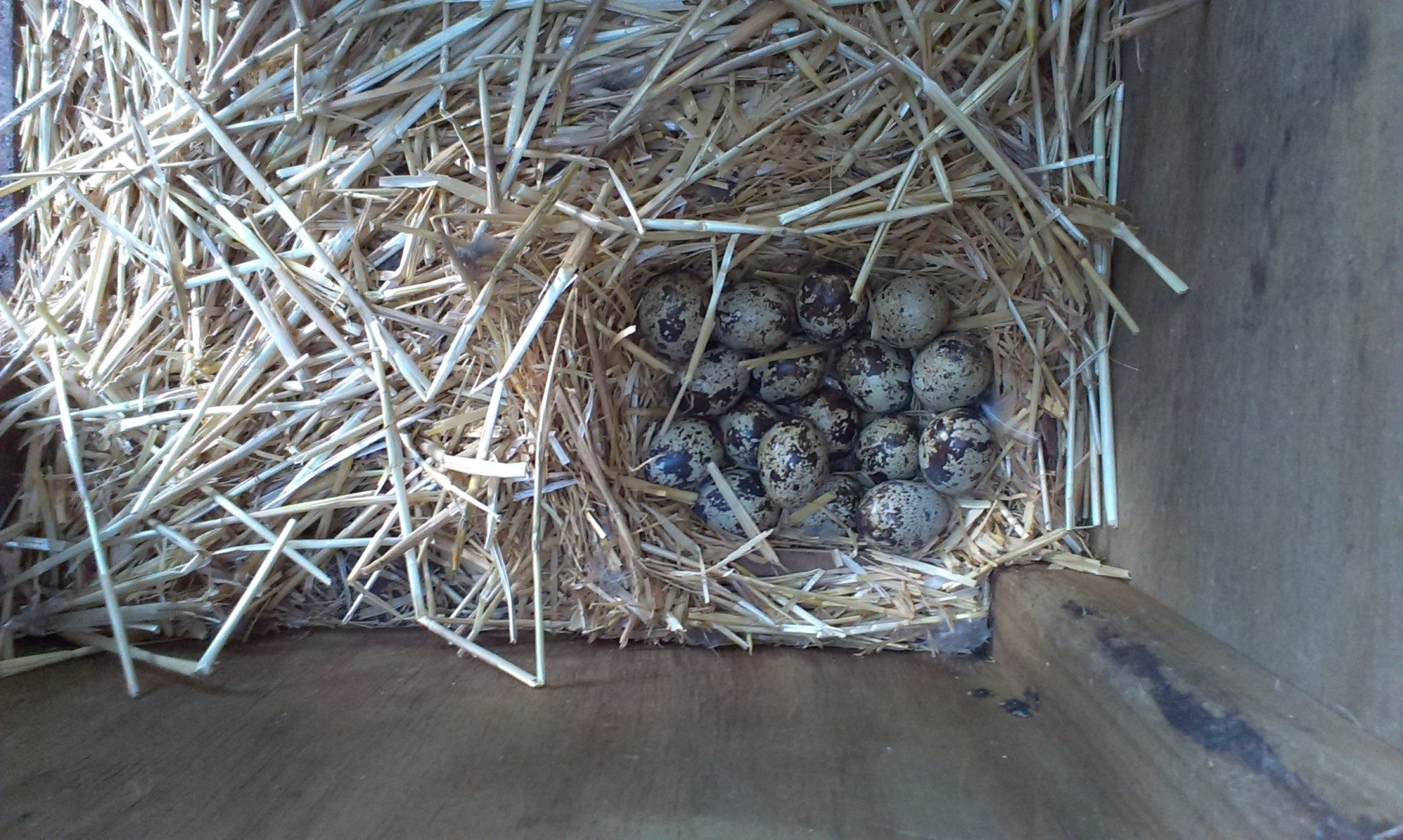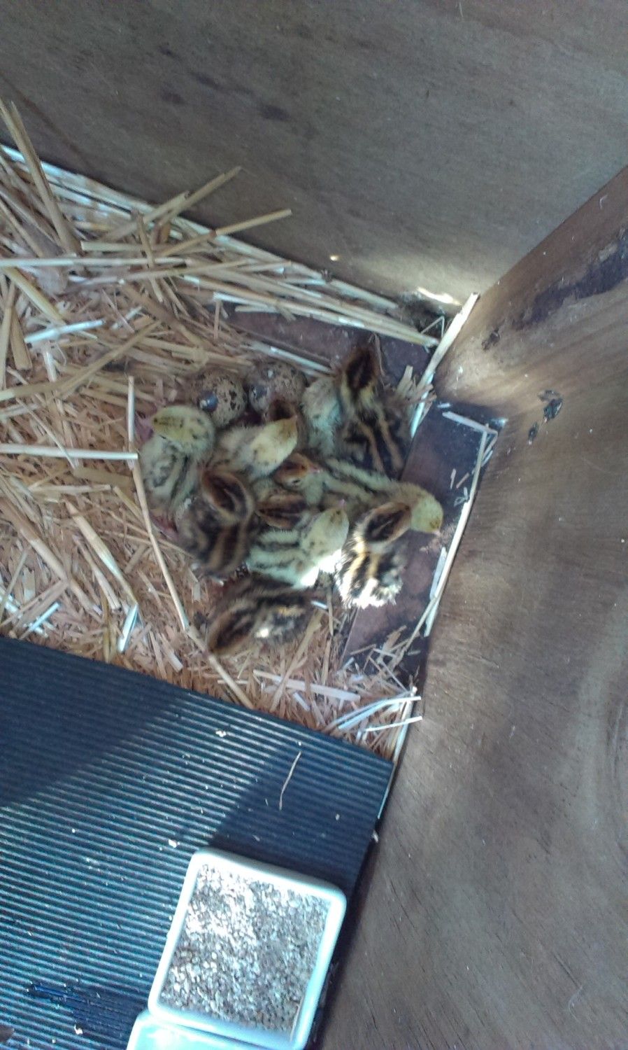 A mass of little quails with some eggs still there. The remaining 5 eggs didn't hatch by the next day and were indeed duds.