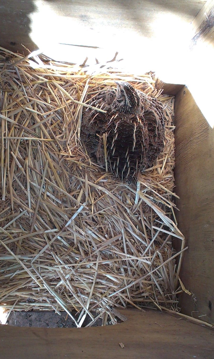 I left her sitting on them to see what would happen. She kept laying until she had 17 eggs. I noticed that she became very aggressive toward the male quail - chasing him around the pen and attacking him. I moved him out and put him in another pen with some girls who were much happier to see him.