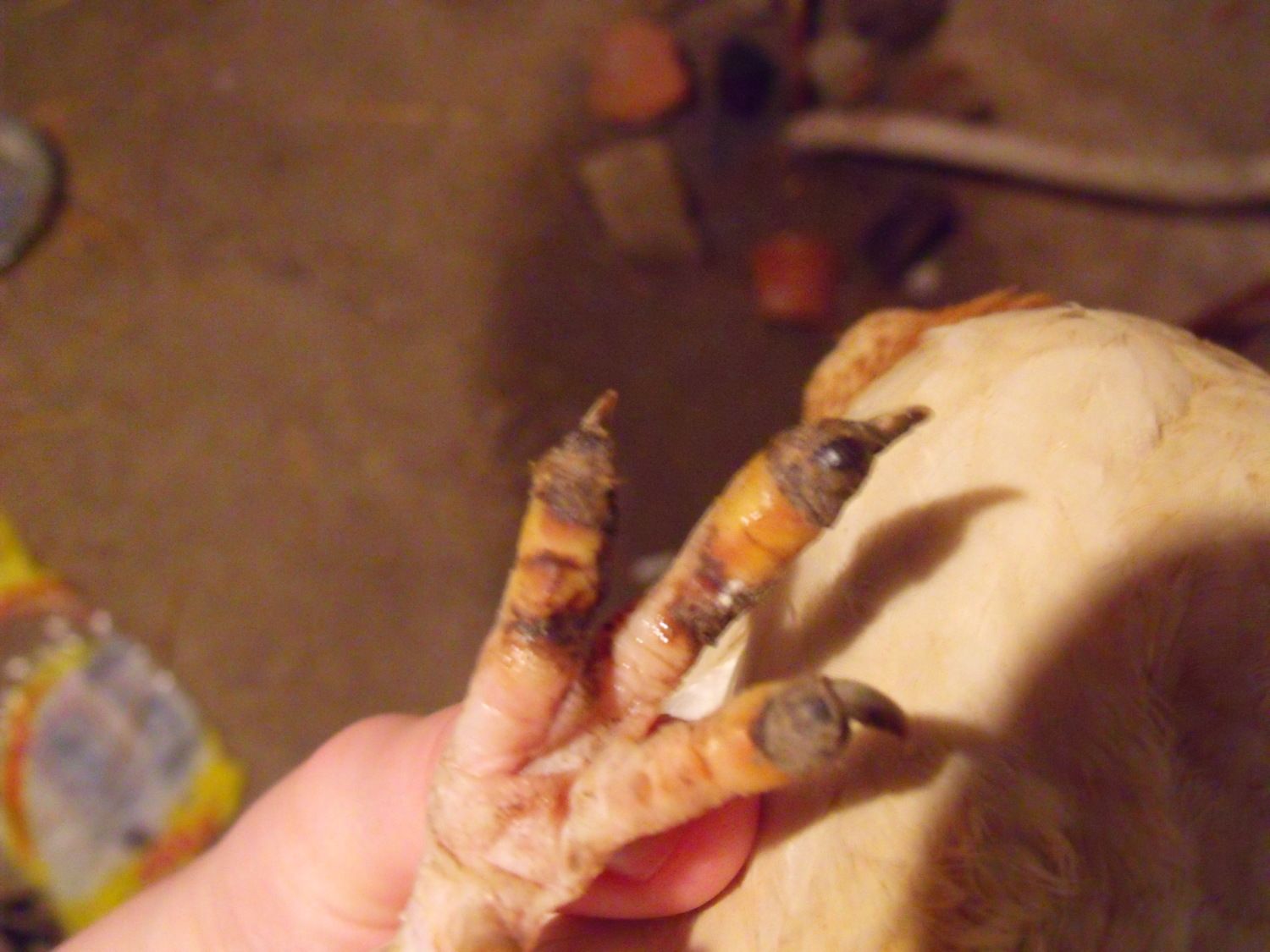 Doesn't look like bumblefoot to me, either. It's actually hard to tell because of the dirt. I also suggest giving the feet a good soaking and cleaning all of the gunk off. When the foot is clean you will be better able to see what it is you are dealing with. The tips of the feet look a little frostbitten to me. Is that possible where you live? You might want to post more pictures once the feet are clean.
