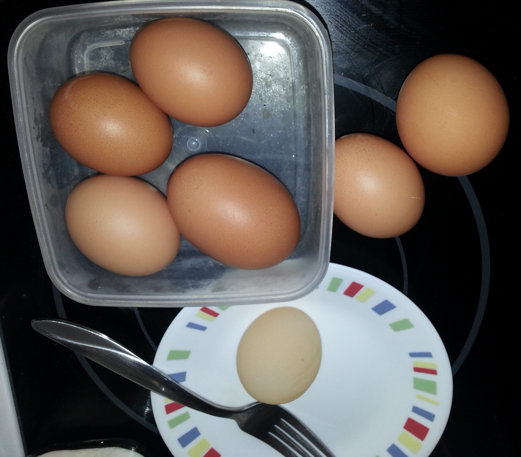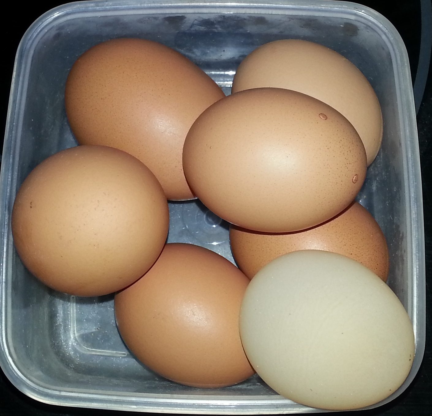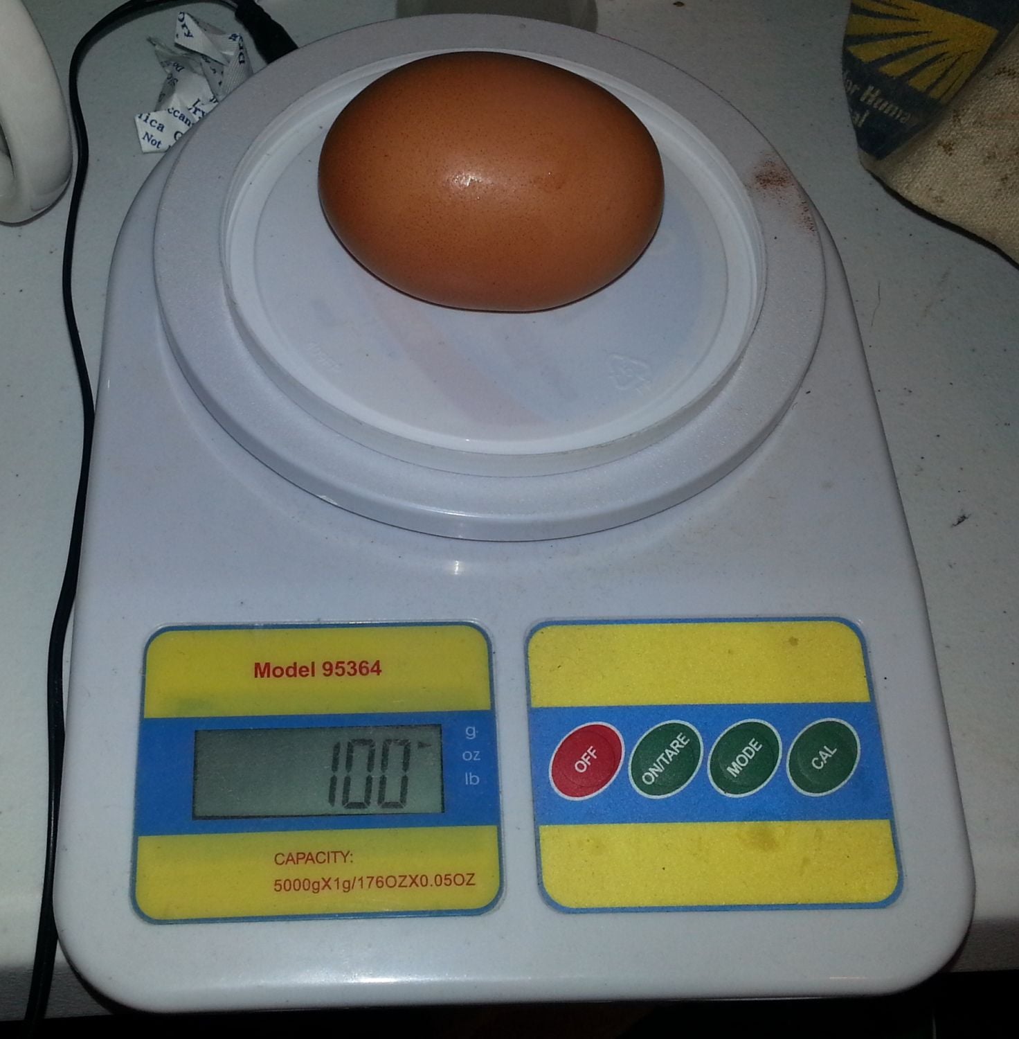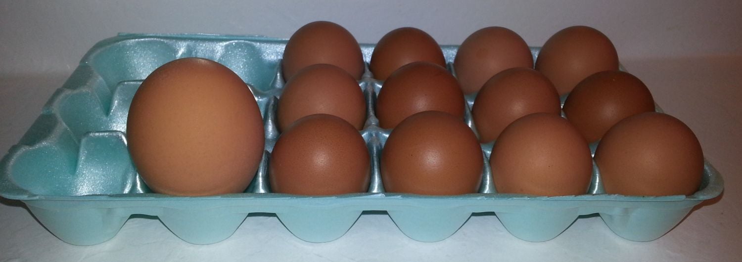 Then a couple weeks later, along comes a monster. My neighbor thought she heard one of my chickens yelling, must have been the one who laid this one. That's a picture of it in a carton along with my regular eggs and the 2nd picture, yes, I zero'd the scale after I put the bowl on there.