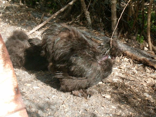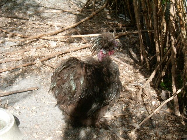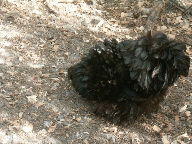 pen includes 1 bearded Splash Silkie roo (from Porto & CJ lines) & 1 NB black Showgirl roo. Hens in pen are 1 black Showgirl, 1 bearded black Silkie, 1 bearded black Frizzled Sizzle, and 1 blue Frizzled Showgirl. I have been hatching mainly black & splash babies, but somebody throws me a partridge every so often.