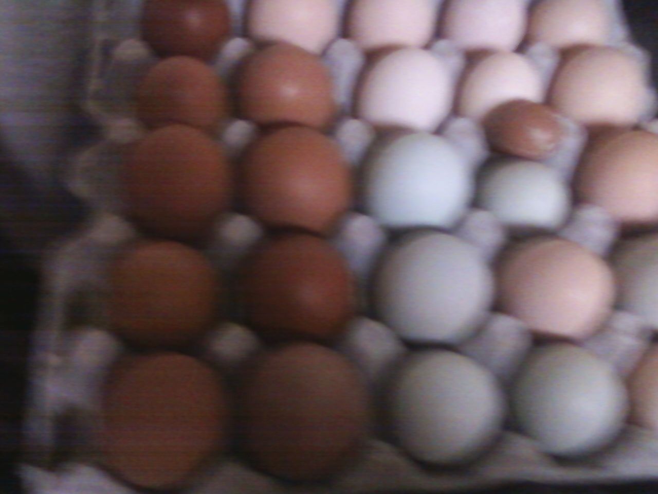The brown eggs are from the welsummers and marans this is what some of eggs might look like I also get lighter colored ones and ones with white film on them.