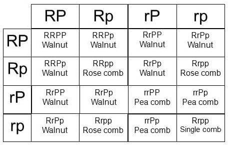 See, rose comp is RRpp. Pea comb is rrPp and you can get it from different parents. You can have an Rrpp rose comb parent and then have pea comb offspring with the correct mating.