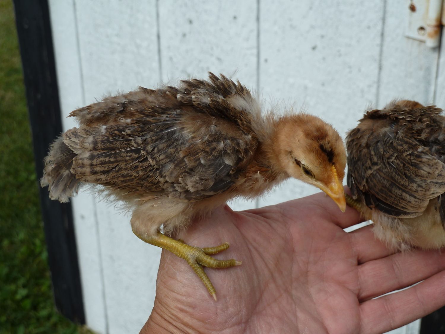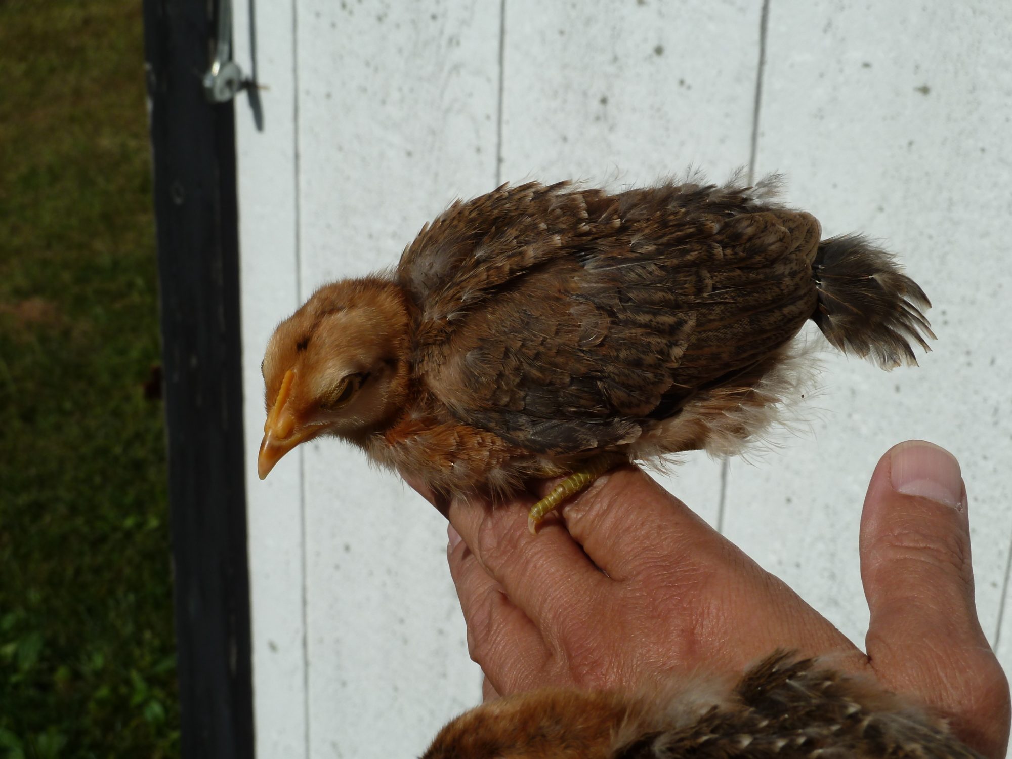 Just got my first pullet egg from a CLBxRIR cross. The pullet on the left is the one that laid this egg. By looking at the OAC chart, this egg comes in as an OAC 60, a very light green.