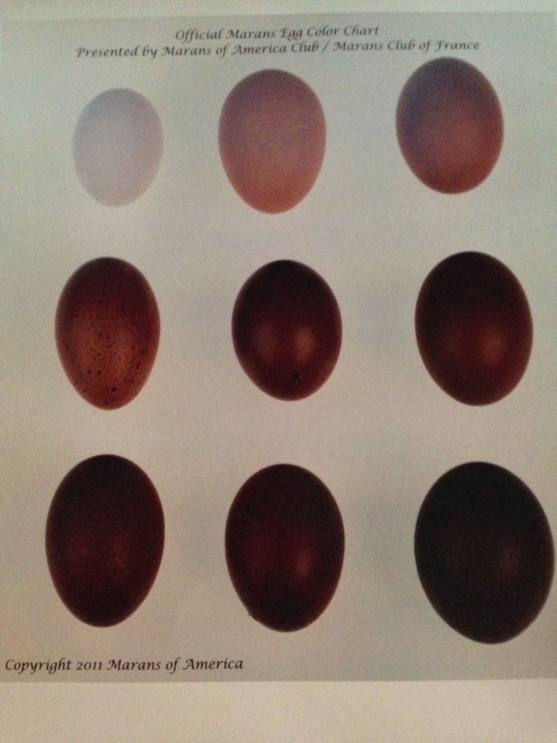 Your Marans egg chart looks very different from mine your colors seem to match up with what I have seen other places online. The colors that show up on my chart seem so much darker than other charts I have seen so I dont even use it. Does my chart look proper? May I ask where you purchased your chart from?