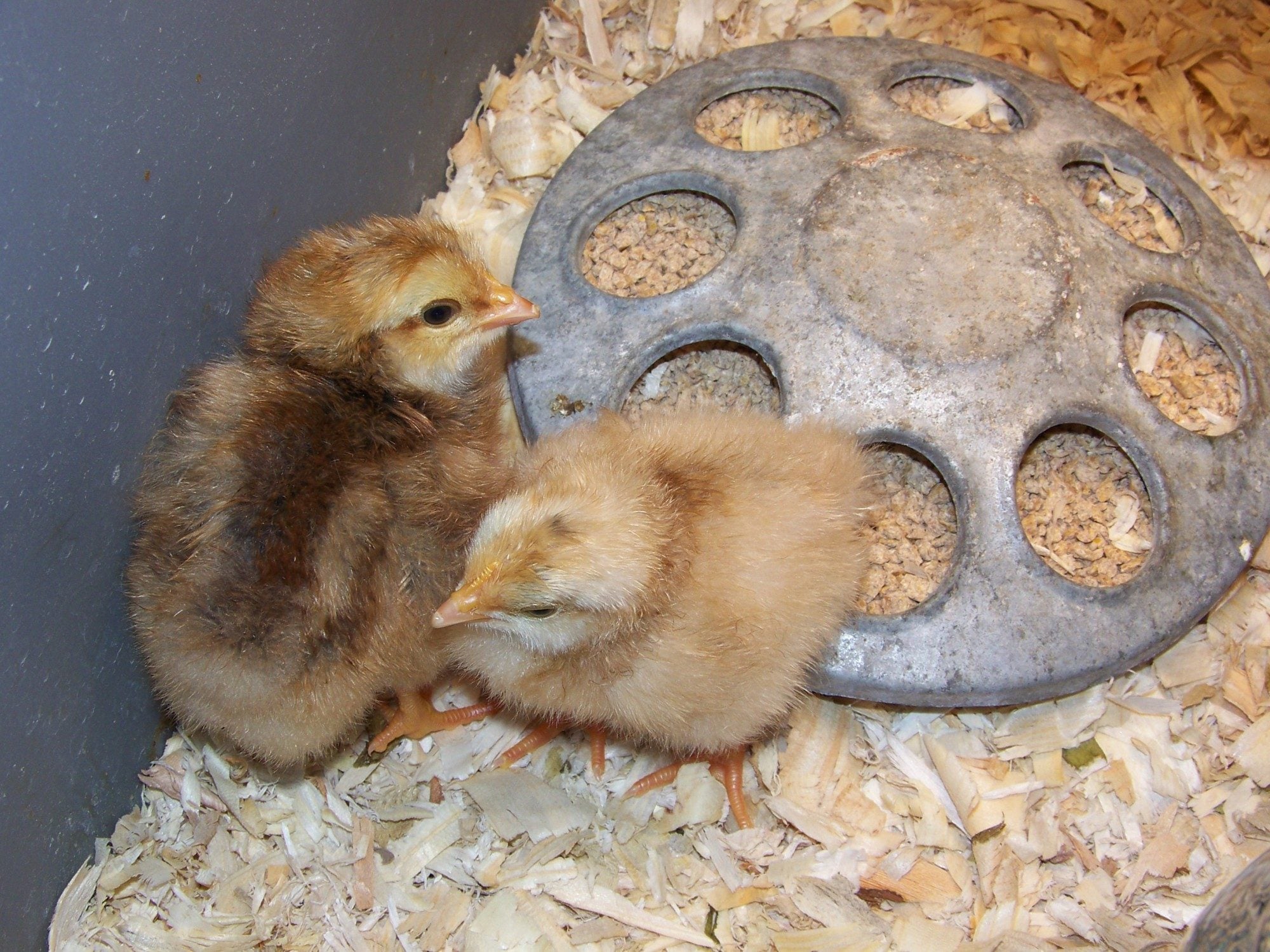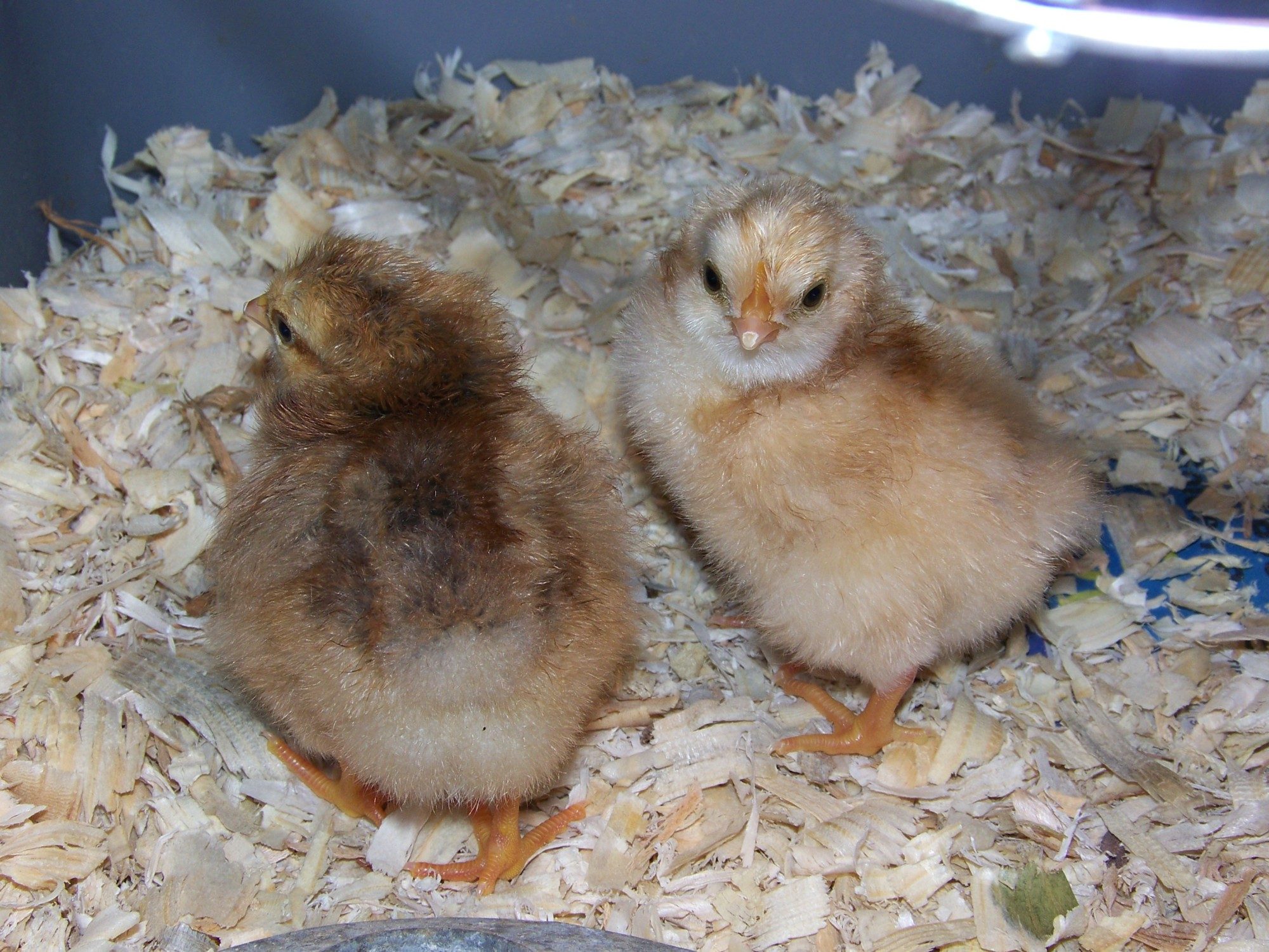 I noticed the same thing about the light colored one. It has a beard and it doesn't have the white patch on its head or any dorsal stripes. It also has a darker color on its neck which remided me of a wheaten chick with a sigle colombian pattern gene. Does the darker one have a large white patch on its head? If so it could be a male Legbar, but it doesn't have the distince dorsal stripes of the female Legbars for wide eyeliner. I lived in Creek Country for about 10 years and even worked in Kellyville one summer. I know a breeder in North Tulsa that has one of the best Cream Legbar flocks in the country. If you want to add any chicks to keep these company PM me and I will send you their contact information. They should have chick the same age as yours so you can band them and keep side by side compairisons if you want to see the difference and they grow.