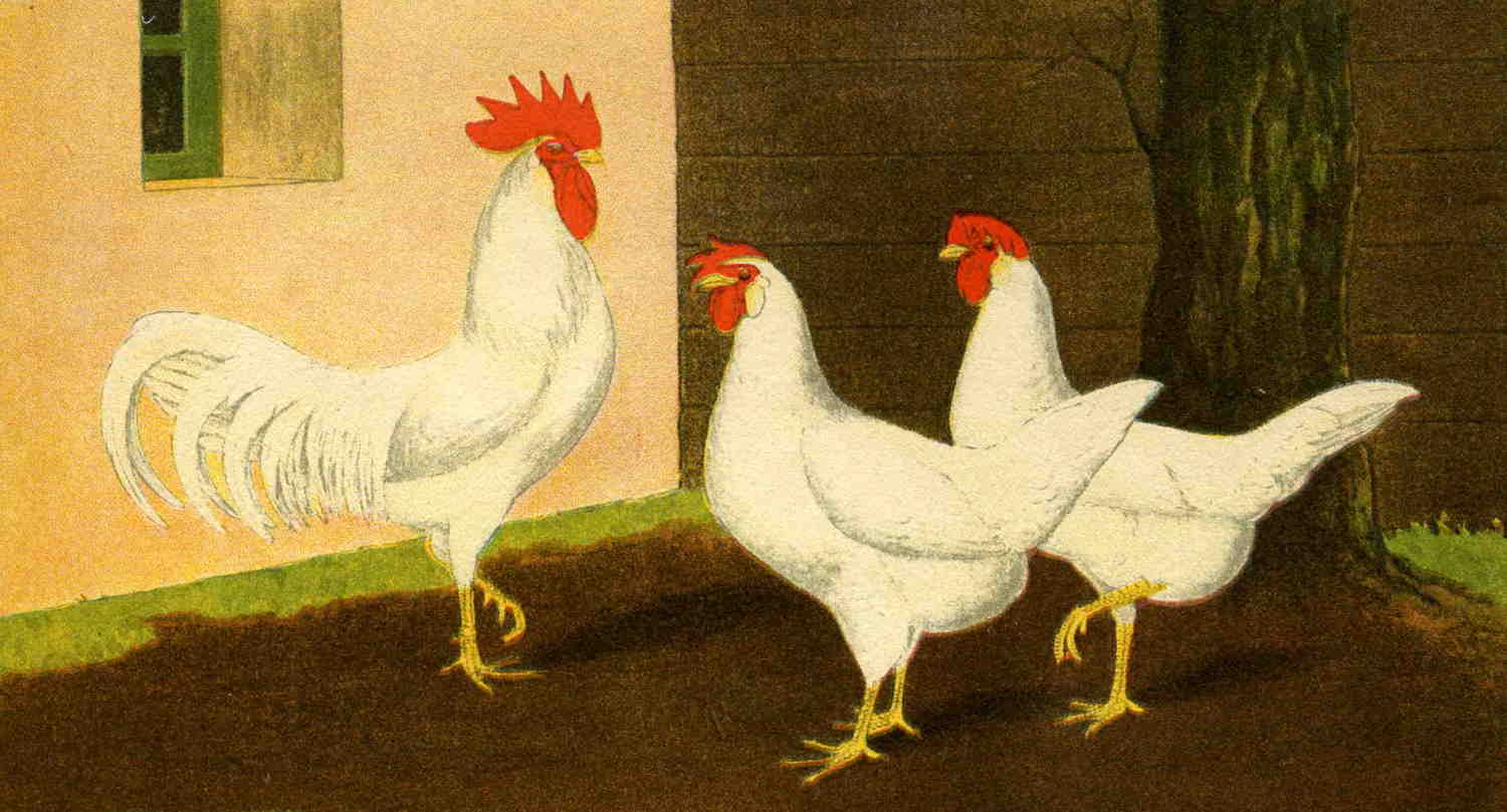 Here is another illustration of an English Standard white leghorn. It shows the smooth transition from the back to the tail without any sharp angles. This illustration also shows the moderately long legs where as the buff and brown leghorns above show the dumpy or moderately short legs.