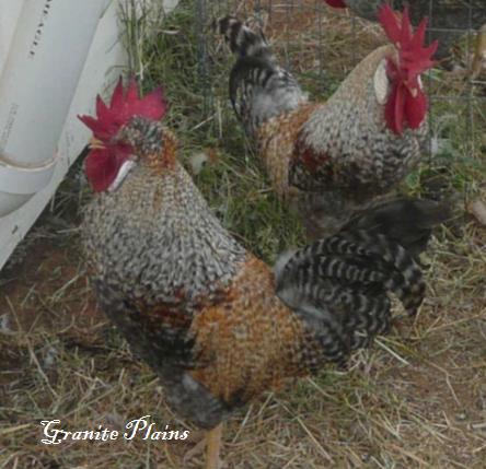 Here are The light and dark cockerel from the photo with the pink background above (both of them were culled). The dark cockerel is in front and the light in back. About the only difference I could note between these two wild type color patterns is that the red enhancement was sharper on the dark down type and a smudgier expression on the light down type color pattern. So....we gave up on the idea of standardizing down type and decided to wait until we got the mature color where we wanted it before worrying about down color. We are still working on the mature color but are getting closer to where we could start working on down color as early as next year if everything goes will this year (it never does though. There always seems to be set backs so maybe in 2-3 years) :-).