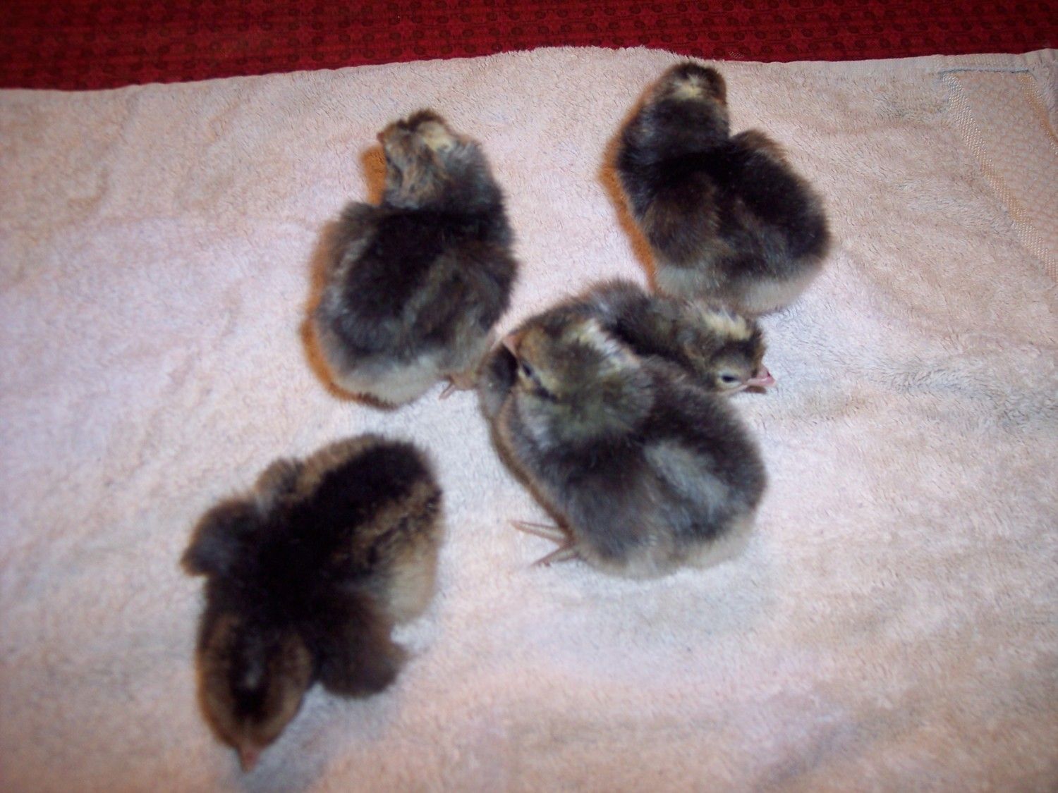 I am sorry about the bum-legged one. I had a Wheaton and Black Copper Marans both come out with bad legs from a hatch last fall (too high incubation tempurature?). The Wheaton was able to correct itself after about 3 days (with therapy) and never had trouble after that. The Black Copper never was not able to get its leg under itself. We tried hobbles, boots, etc. but nothing seemed to help and it got worse with time.
