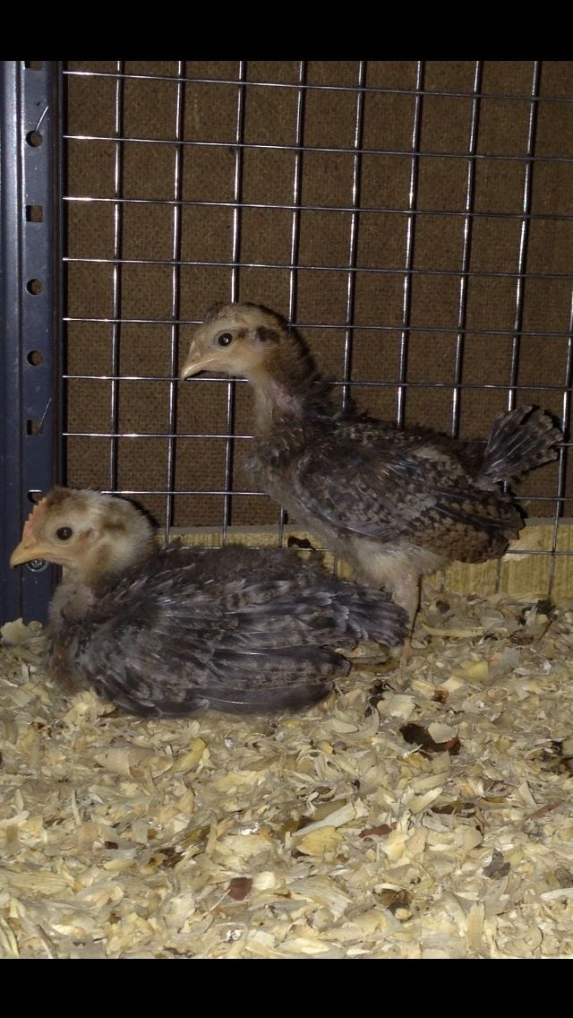 The spotty girl looks so much like a crele oegb hen. She has some barring on her tail. The spots are not so much random but seem to line up in rings if you were to connect the spots. It will be interesting to see what she looks like as she gets older. They are right at two months old now.