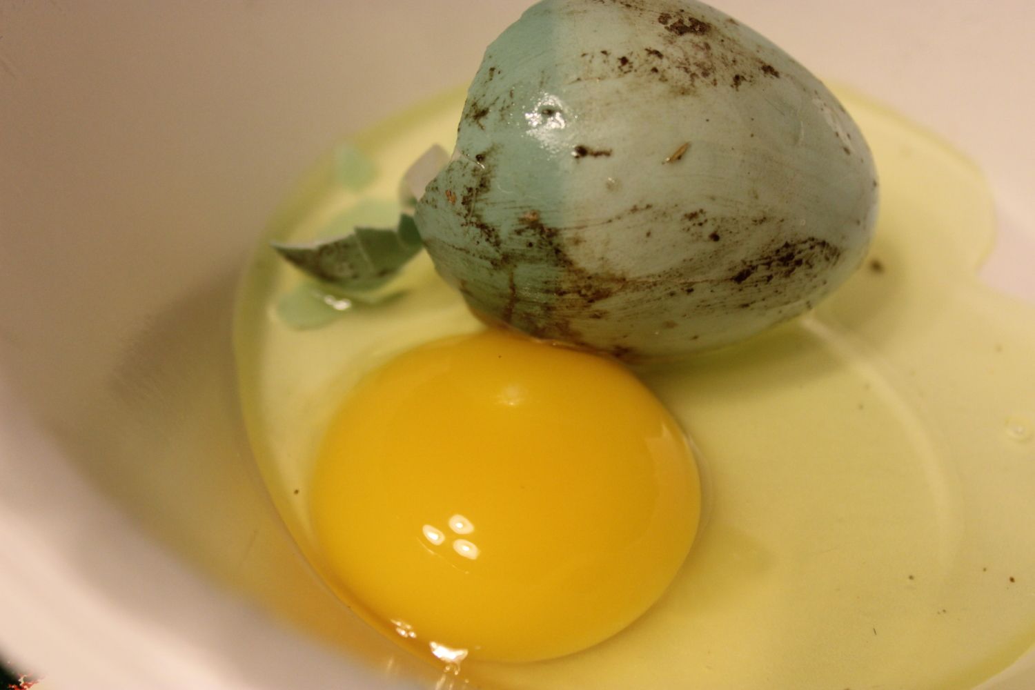 Flipped them over and stripped off the membrane and was surprised- the one that was lighter on the outside was slightly DARKER on the inside! So I guess it was just a glitch in the hen's system and somehow the color on that end of the egg got drawn to the exterior of the egg.