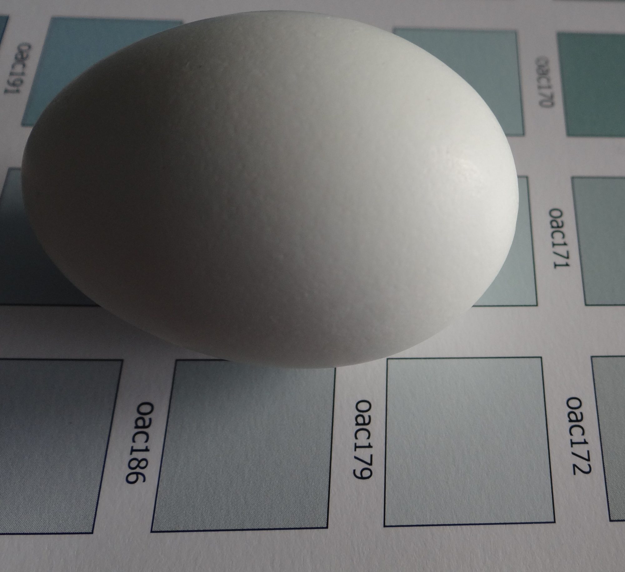 So CJWalden, and lots of us are getting slightly different shades. oac102 is really a true green to my eyes....oac123 is what a lot of 'blue' eggs are. I have an EE that is now laying a oac116 and I like that color for its saturation.
