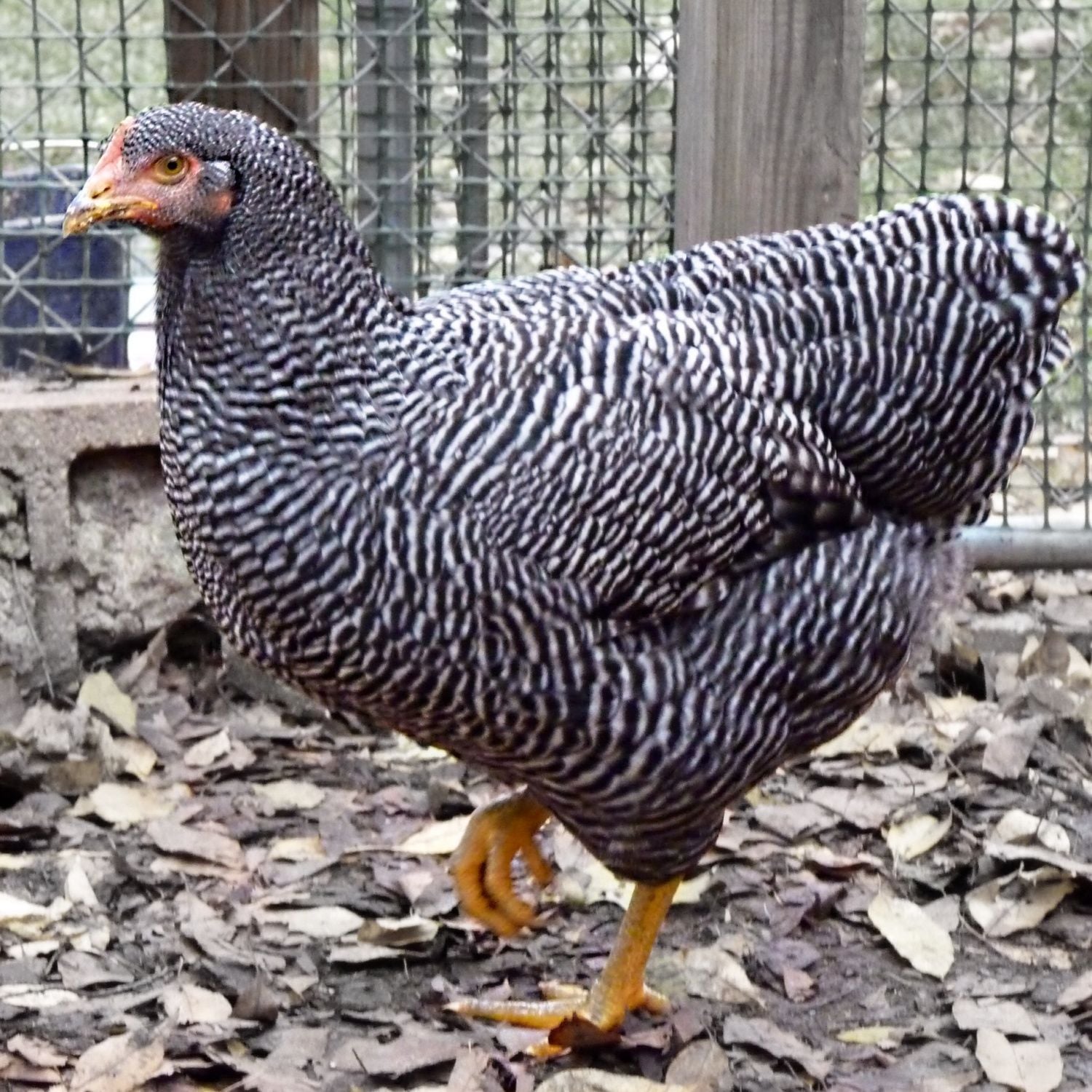 If a bird is a BPR - they want slow-feather growth - right? Because that creates smaller, closer together bars.... But if you want a productive egg-layer you want a fast-feather growth so you can get hen back into production - she is a quick molt chicken...(Gail Damerow is the source of this for productive hens I think)....... So a wide barring like our hens have would indicate a fast feather growth - Right? :O)