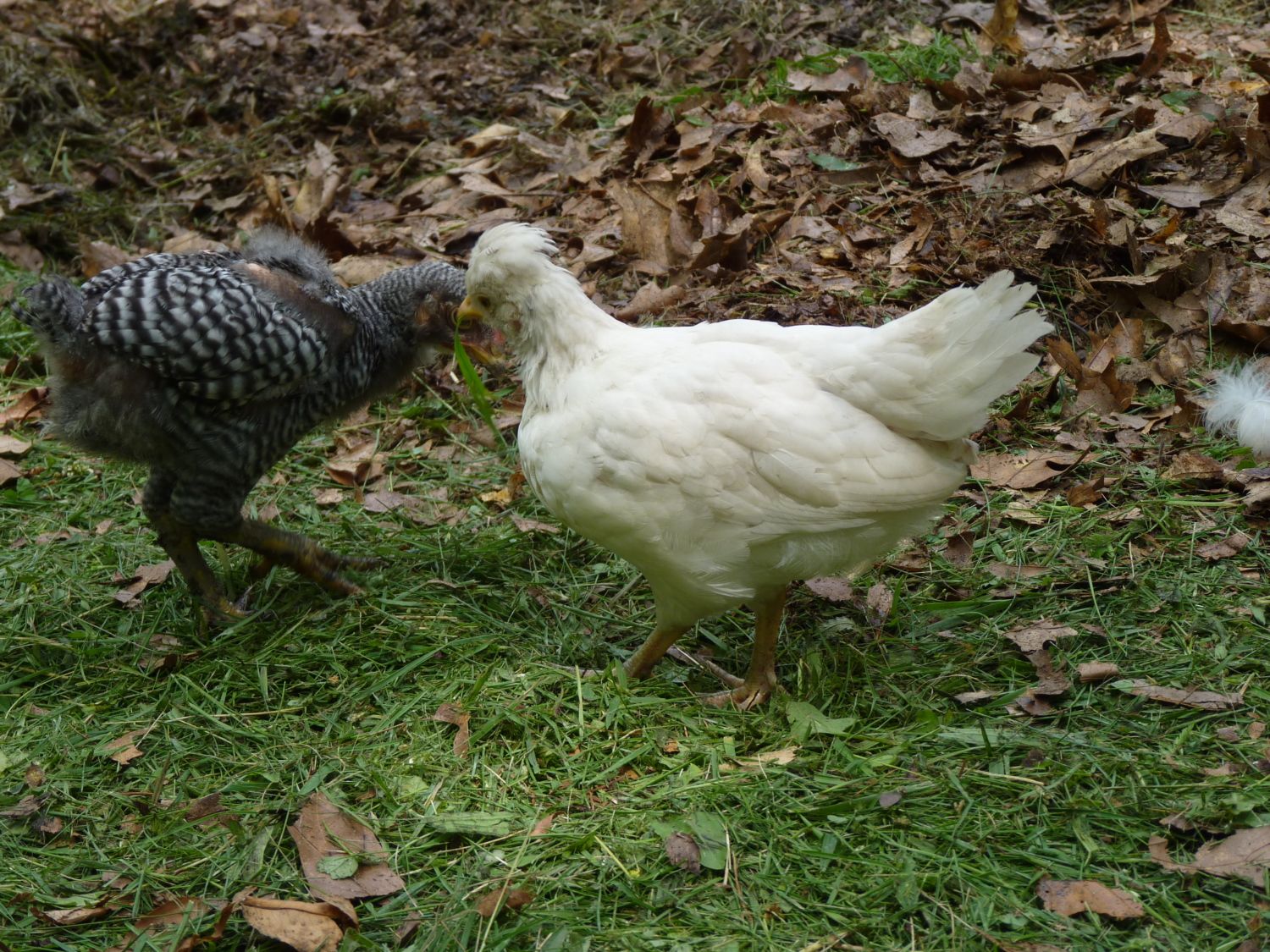 (FWIW the white chick is a Cream Legbar/Polish cross, not a white sport.)