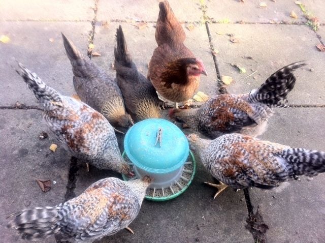 Hattie and ... not sure but I think it's Favorite Boy. They are stealing scratch/layer mix from the big chicken's doorway. I think the boy is keeping a lookout for Big Stuff the FBCM Rooster!