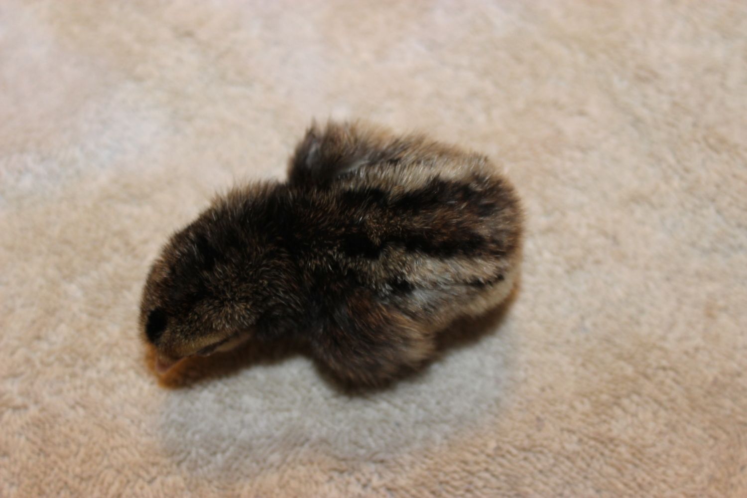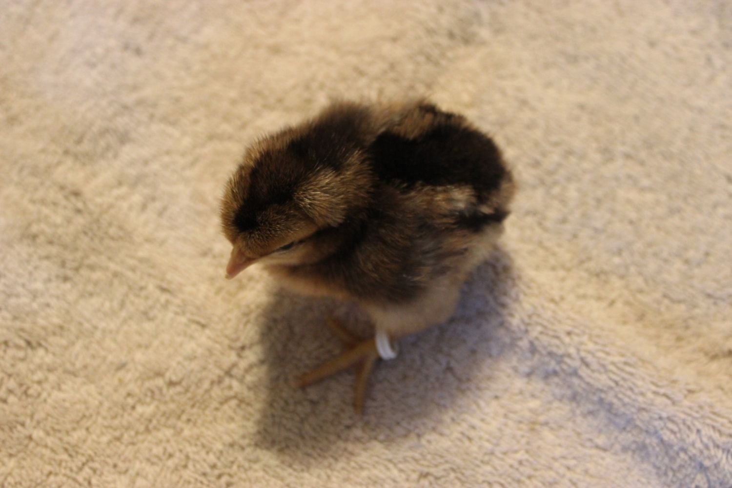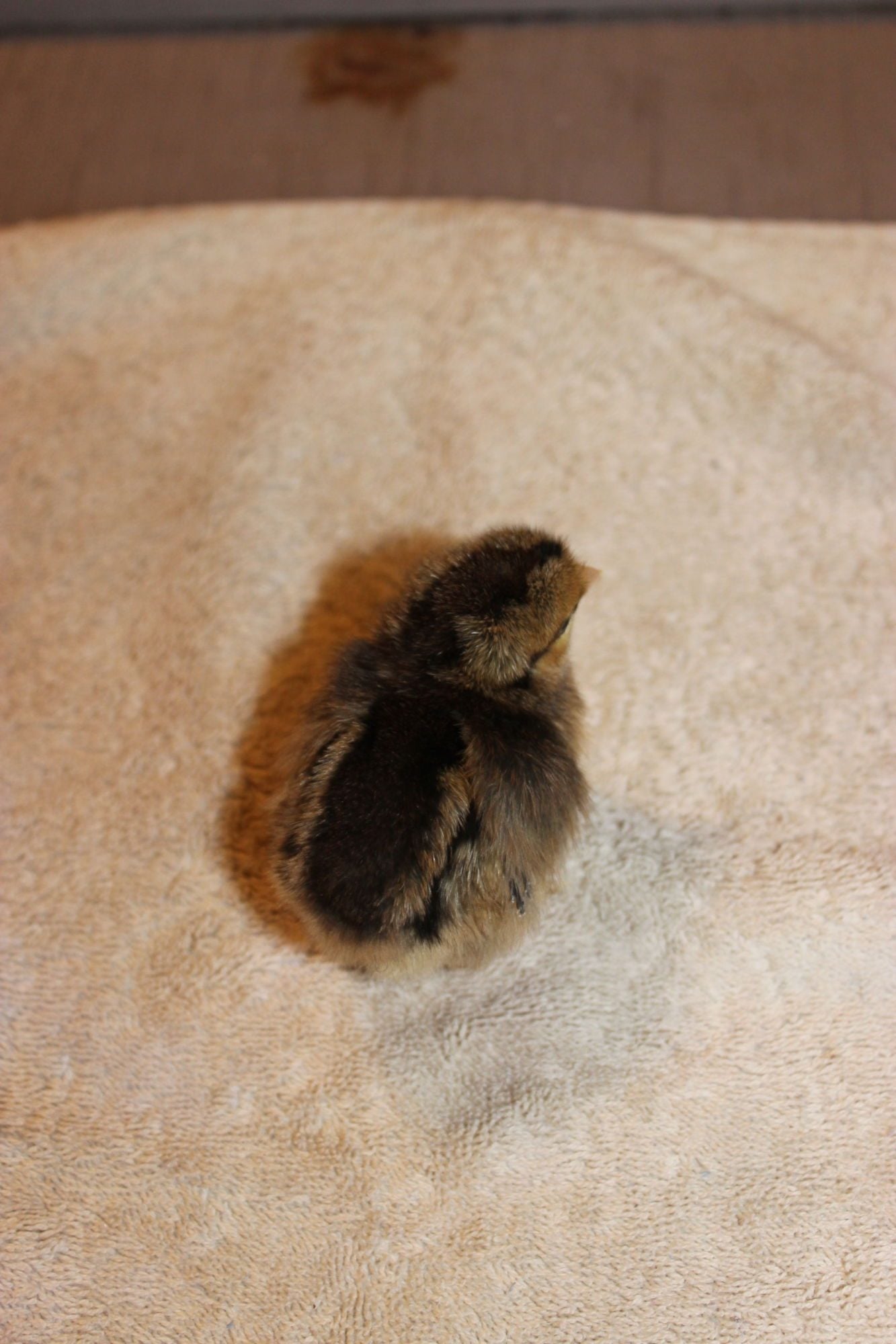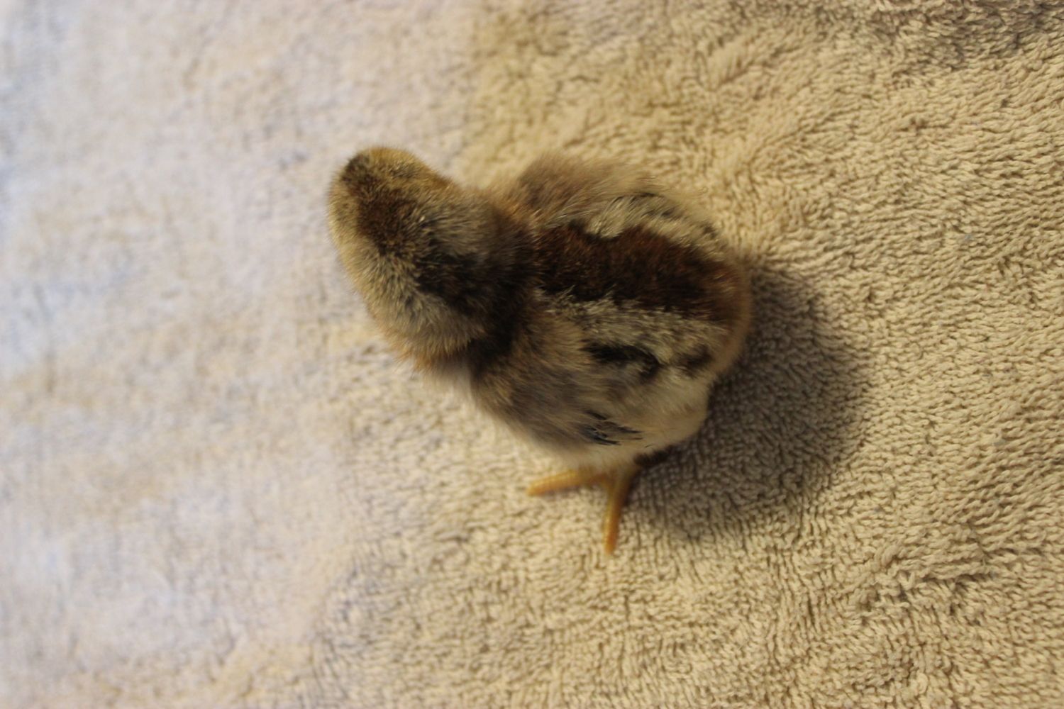 Orange- DARK/black well-defined stripe. Black dot at comb, cream down on sides, yellow underside. Light center the the stripe. This one hatched from a pullet egg and has crooked toes.