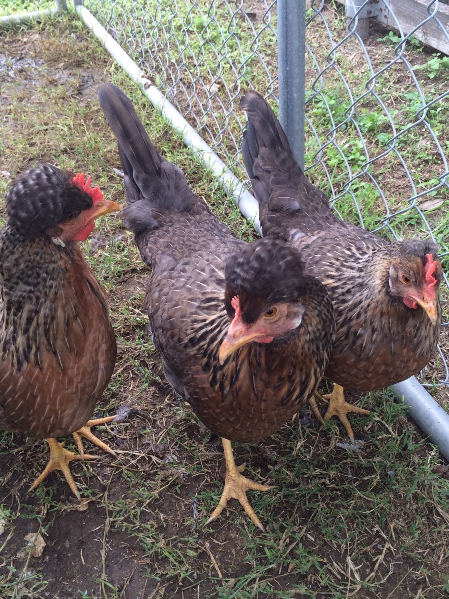 Hi ya'll, I know it's been awhile, I had a very busy summer! I thought y'all might want to see how my JR chicks are doing. Above is a pic of the JR roo at 15 weeks. He's bigger/stockier than the Line D roo I got at the same time. His tail angle better than I've had on any roo thus far. Color? Well, y'all know I'm a fan of more than less, BUT he's not as light as some JR's I've seen. And he has a visible crest, but, alas, a wickle comb!! And it's actually gotten worse as he ages (I guess this supports the idea that u can't hv a good crest and straight comb at the same time?). Sigh. But he's gonna be a nice cross w/ my foundation hens (and the 2 line D hens that are too gold) that need a little meat, a better tail set and bigger crest. And my foundation girls seemed to produce straight combs....