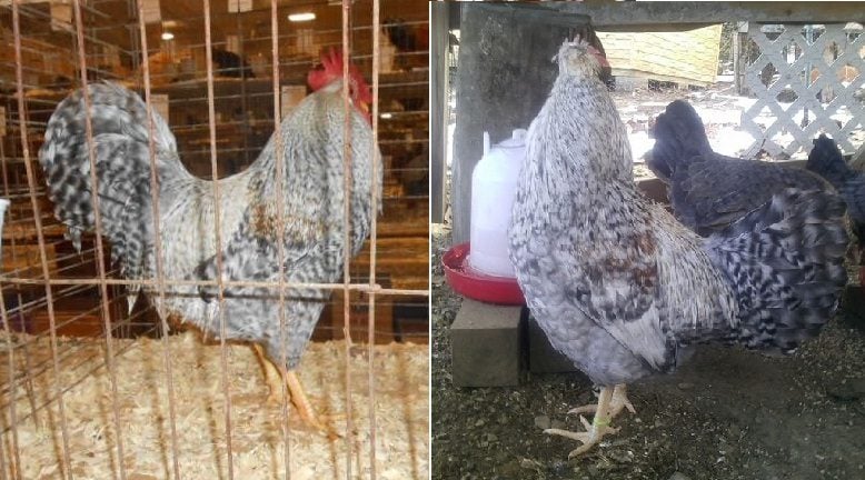 KPenley Male: this exceptional male shows not only good melaning barring, but Well Defined Barring which is impressive on Breast(well defined barring and as dark as Tail) Hackle, shoulders, Wing Bow and Coverts, and Well defined Secondaries(AKA Wing Triangle) the Saddles is lacking a little bit onthe grey barring but not devoided of it(ofcourse) oh and very nice yellow shanks..