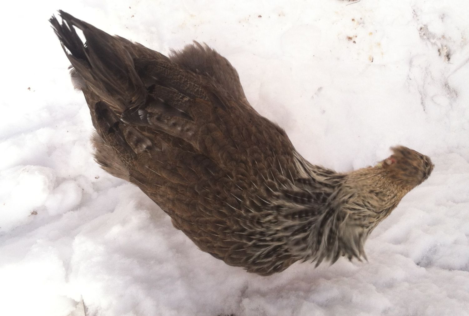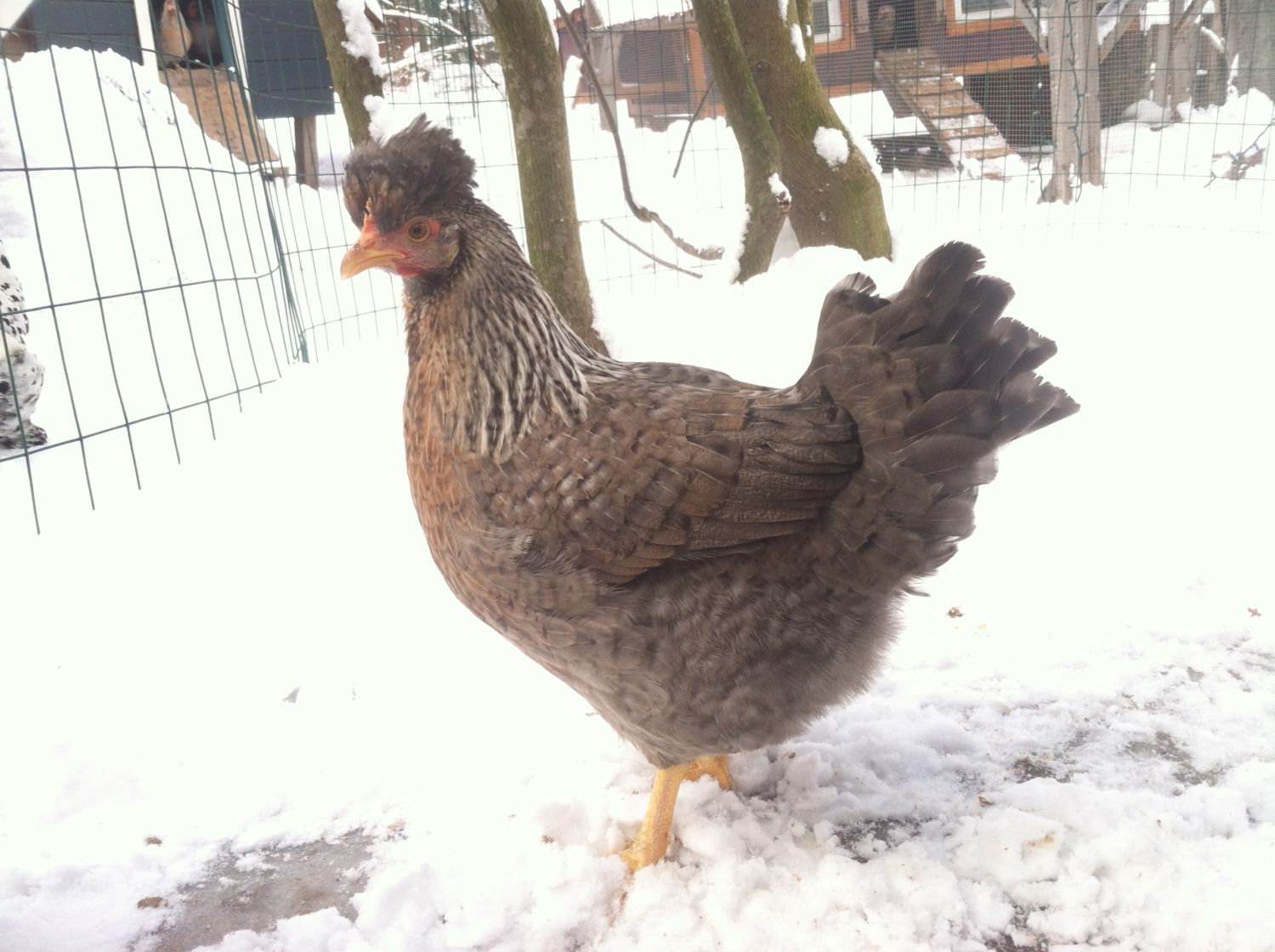 This pullet the wind blew as I took the picture and I was able to get a better snap shot of her barred hackles. I also love her Cream colored hackles against the white snow background. Also note her tail doesn't seem as tented as her sister above.