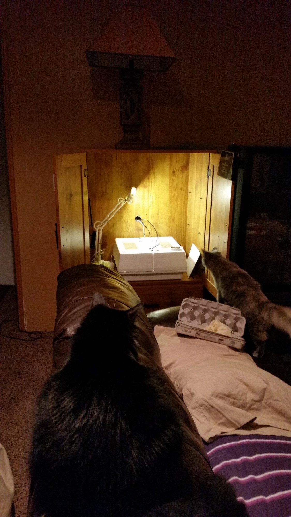 Thank you, I will! All I have is one of those cheap styrofoam incubators, at least it has a fan! This hatch, the incubator went into this entertainment center.....for obvious reasons.....note the interested predators watching my every move!!!