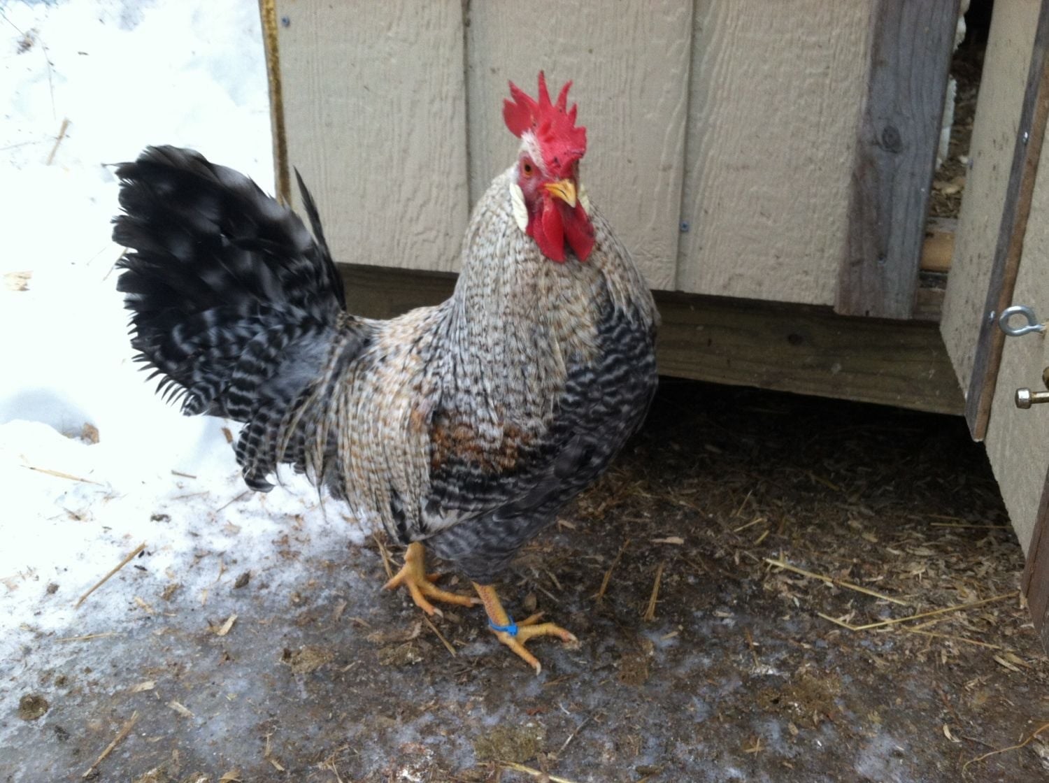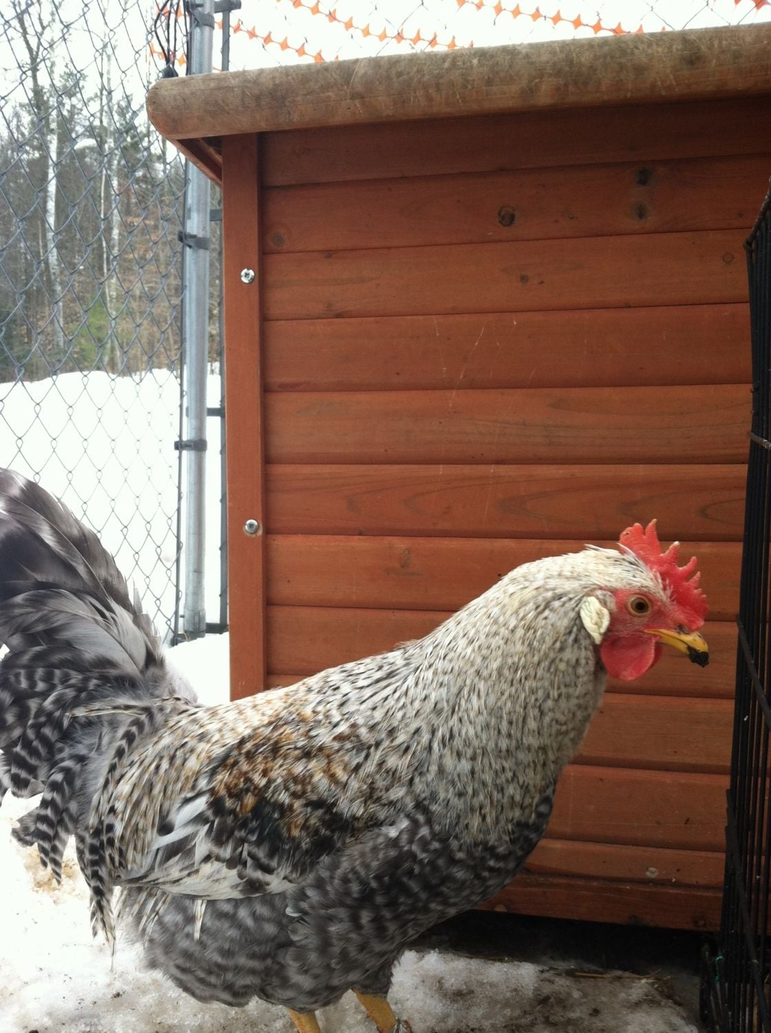 Thought I'd post a pic. This is Macduff. He looks a little irritated with me but I love this picture. Since I culled the other 2 boys he's really enjoyed being the Alpha. My other boy Macbeth is such a sweet boy you should have seen him sitting on the testers lap just loving all the attention. Macbeth is lighter in color than Macduff but his comb is much smaller and I think it's because he is low man on the totem pole. I'll have to see if I can get pics of him. Gonna try and separate the two boys later in the spring. This was just before my NPIP retest when I switched the birds around in the coops. It seems my big coop is sinking in one corner so I put the Marans in there. I'll have to use my husband huge jack to raise it up once the snow melts but man is it muddy and mucky out there. That big coop is giving me so much trouble but I knew I was putting it on loose soil so partially my fault.