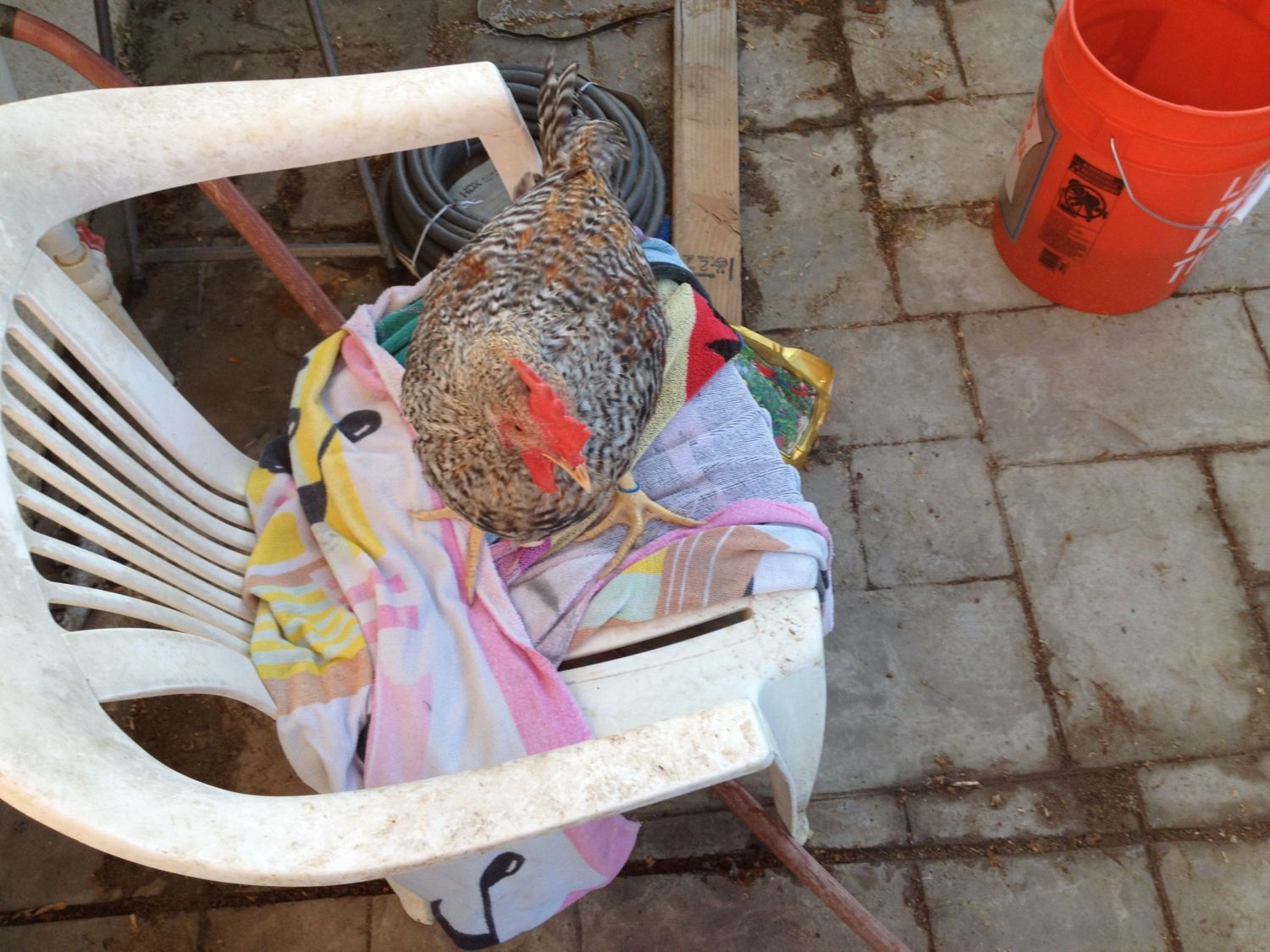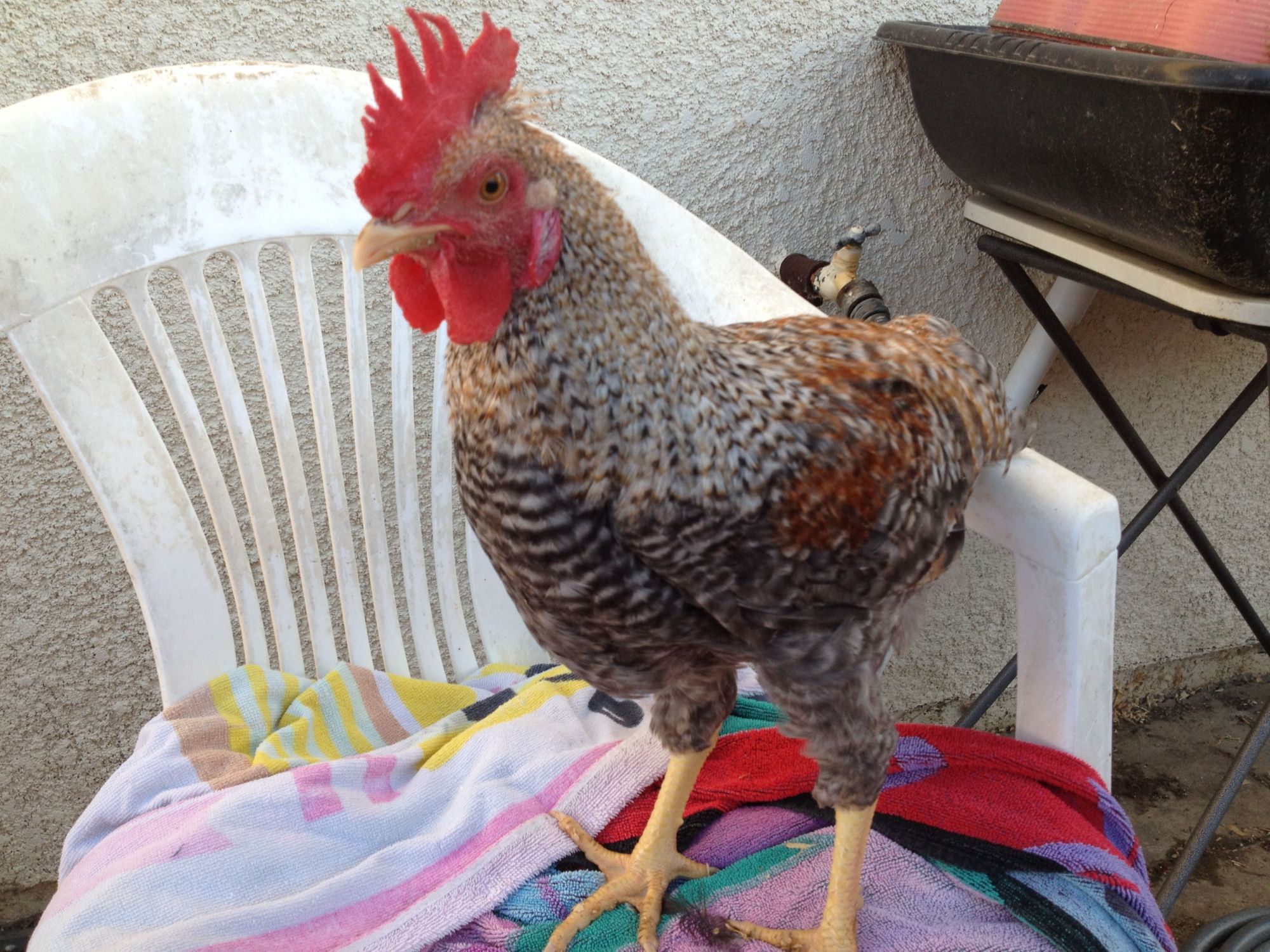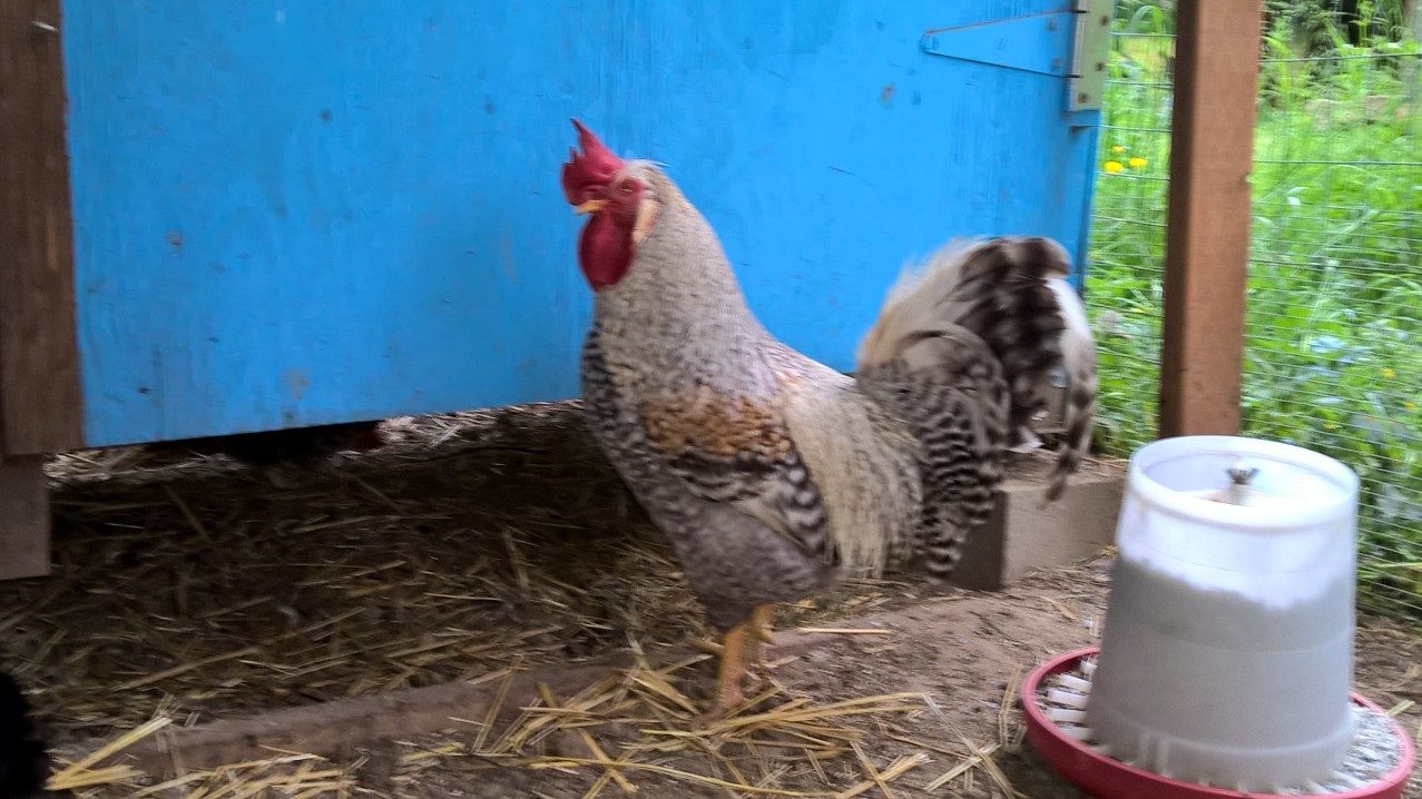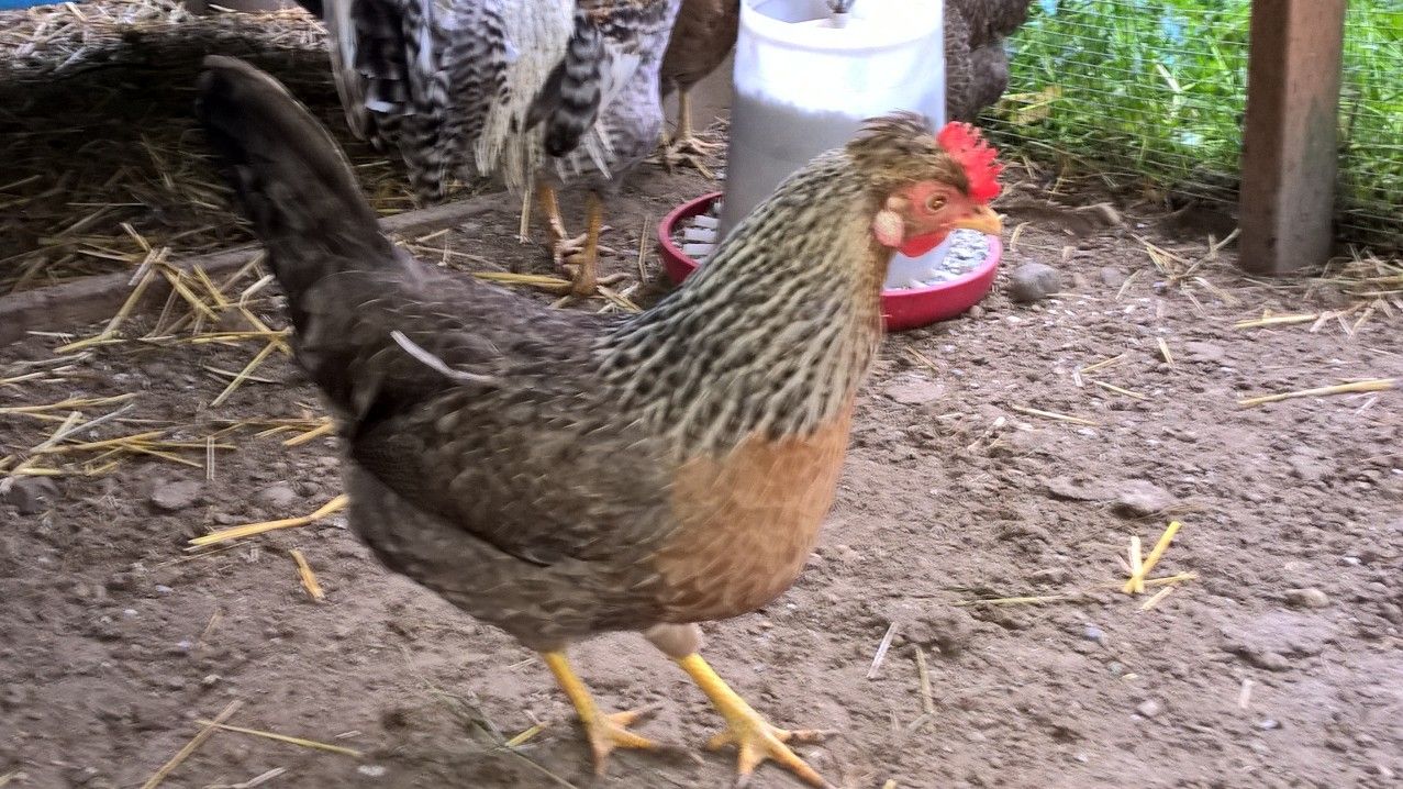 I'm stumped. The head, hackles, saddle and tail are pretty correct. The darker barred areas are diluted. Dr E. thinks that there may be a line with the allele Di (Dilute) that usually is associated with Buff or even some Silver breeds. Perhaps in this guy's past there was a cross that introduced Di to his gene pool.