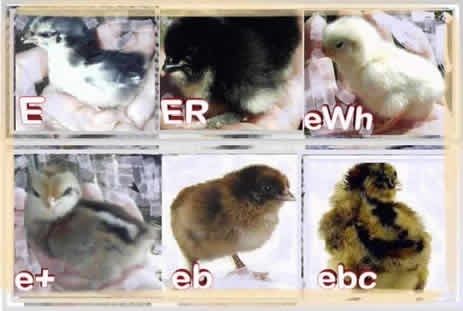 Keep in mind that it is mostly about general patterns, where both sexes have the same chick down, but it shows some good pics of different e locus patterned chicks.