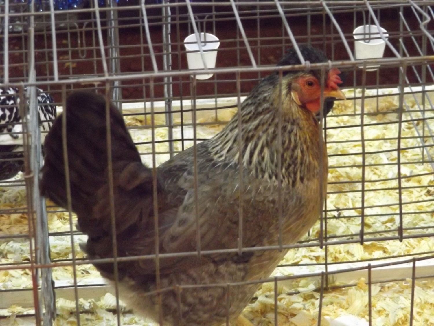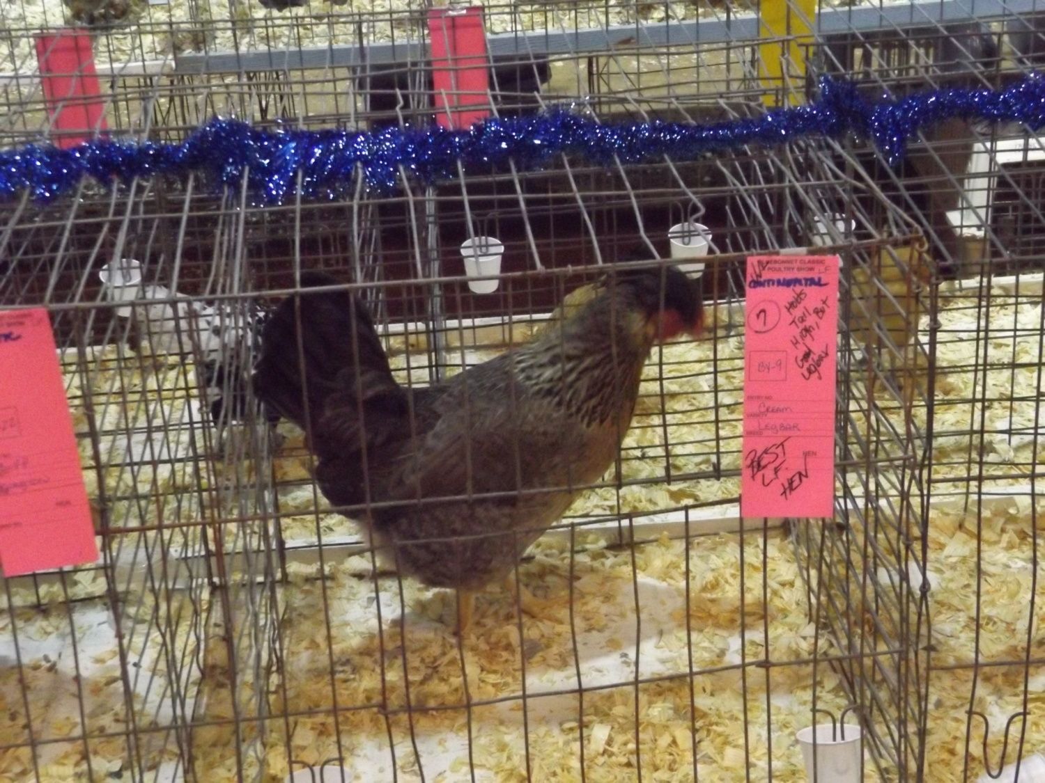 The tag says "Holds tail high, but Good Legbar". The last picture she had just been put back in her cage and was looking rather pleased as he wrote "Best LF Hen" on her cage. It is hard to tell in these pictures but she was gold. All 3 entered were. She was entered in the Continental class.