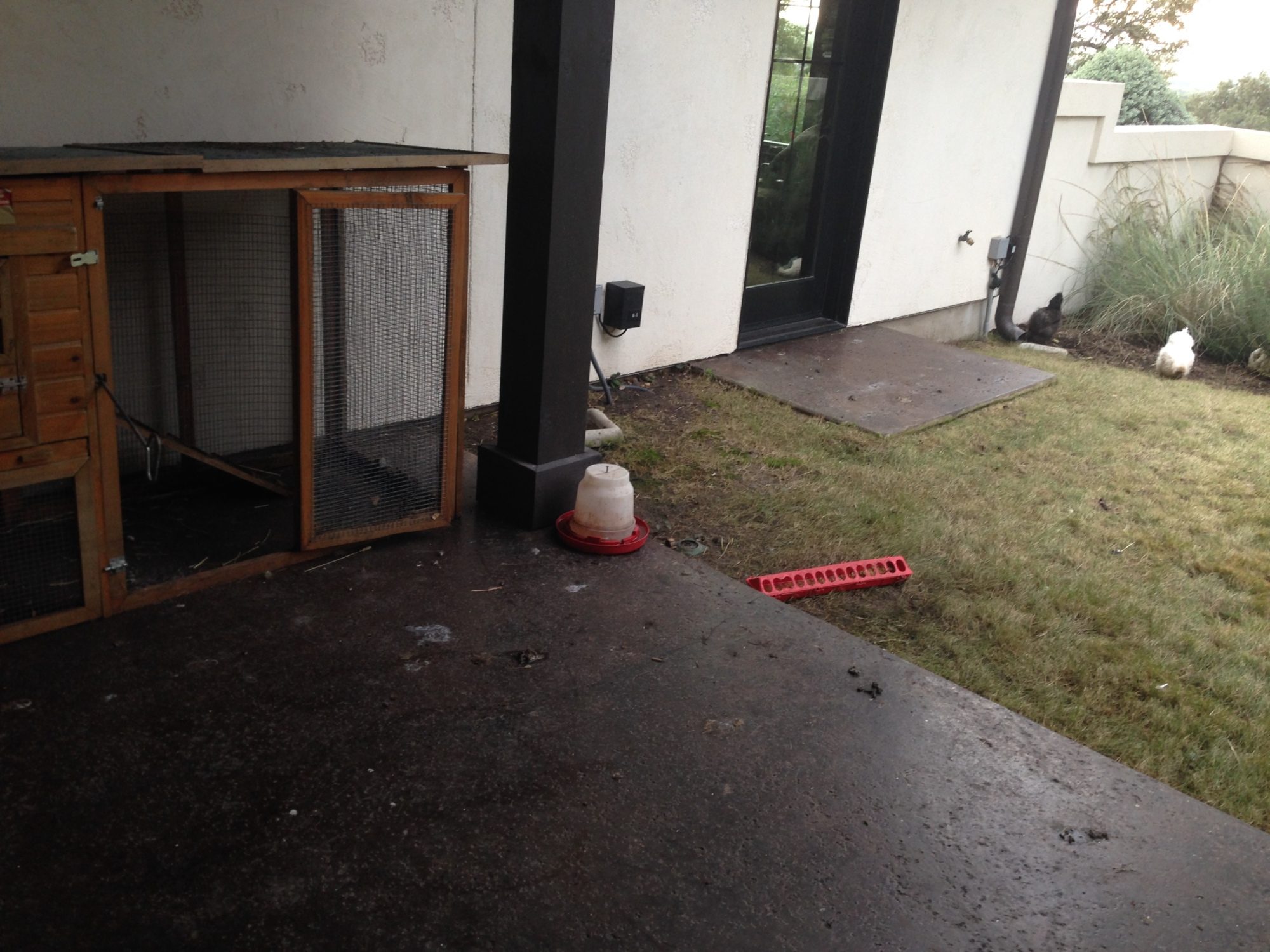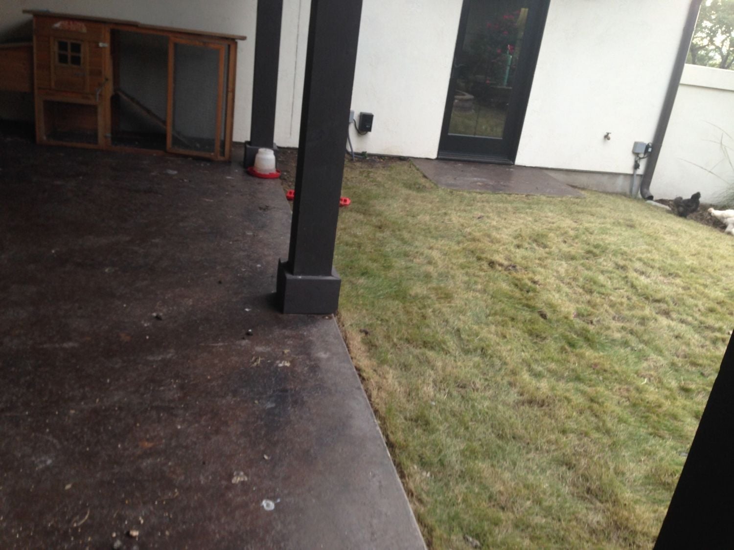 I want to make it where my silky chickens cannot get onto the patio and stay only in the grass (because they make a mess on the patio). My dream is to have them stay in the courtyard grass with a nice (no run) coop and they will free range out there. So I am asking for any possible suggestions for keeping my chickens on the grass?! All ideas are appreciated! Thank you!