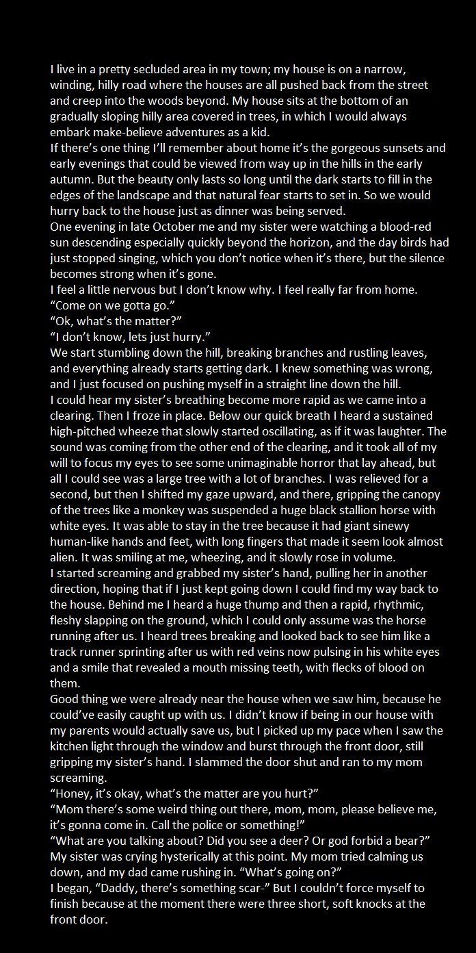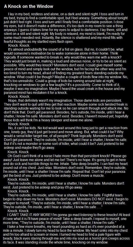 Sep 28, 2015 #2 PerfectPlumage Chirping Joined May 2, 2015 Messages 401 Reaction score 40 Points 91 Location Somewhere off with my birds. That is a nice scary creepy pasta. 10/10!