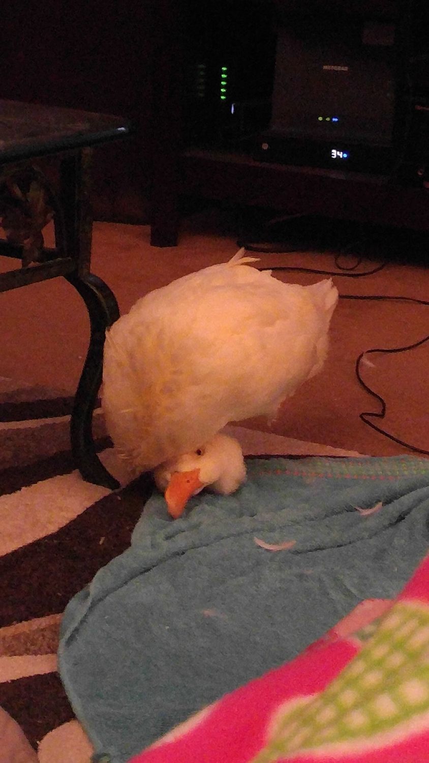 I have a White Crested Duck from Metzer Farms and unfortunately she ended up having neuro issues. I am not sure exactly what she has. I've looked into studies done on Crested ducks to understand more on what could be going on with her. She started holding her head at a weird angle early on and I treated her with wry neck and gave her extra vitamins. She has ended up being a permanent inside duck because of that. I find her on her back a lot in the mornings when I wake up because she is unable to right herself. She's nine months old now and still holds her head weird. I have a picture of how she holds it, it is a couple months old, now her bill is completely parallel to the floor instead of at an angle like it is in the pic. But other than that she is a very happy duck and shows no signs of pain. She's fighting off a cold right now, lots of sneezes
