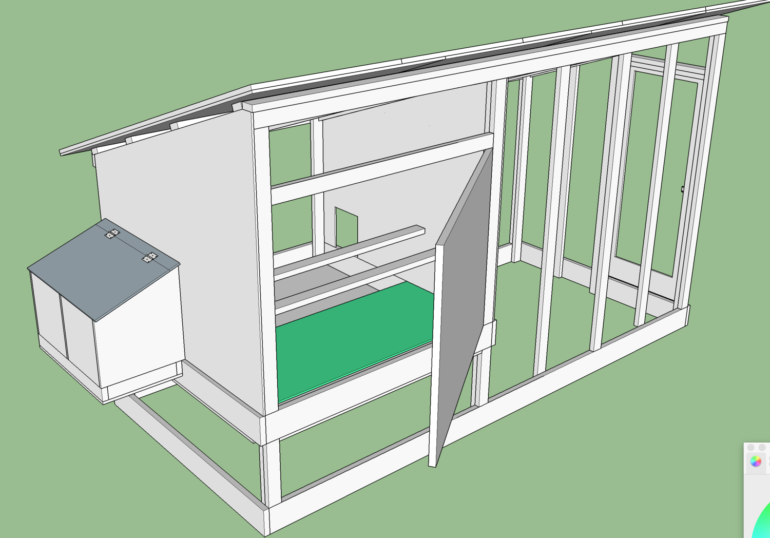 I keep moving the door depending on where I put things in the coop. The little door goes into the run so it has to be on that wall but it could be anywhere on that wall. I plan on having a poop board and a door, here is another shot for a better perspective. The poop board is the green object and you can see how the door will open.