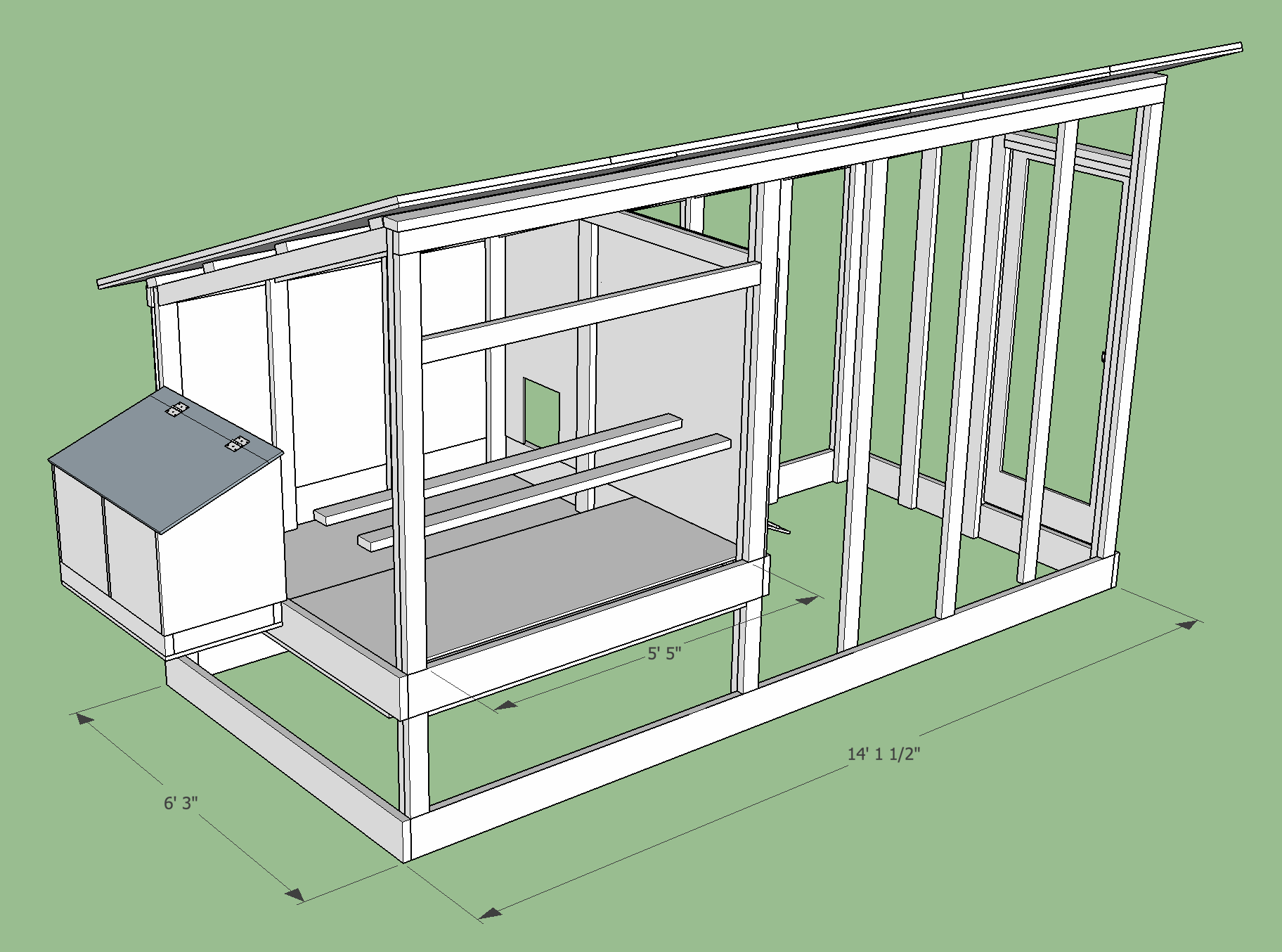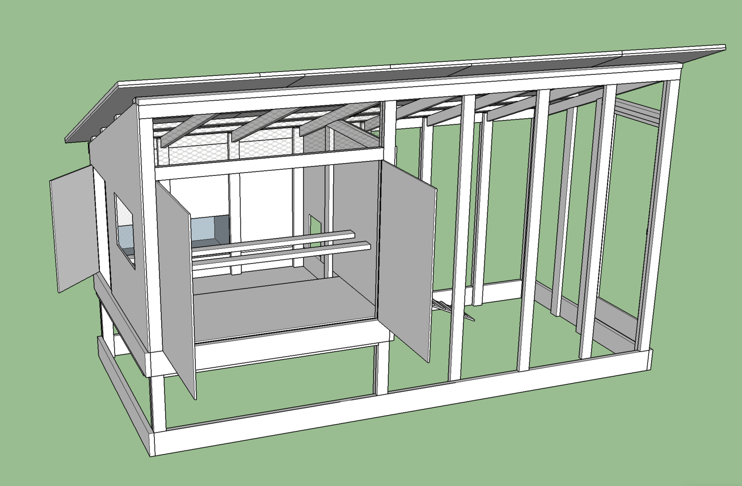 Great work on sketchup. I am planning a coop right now pretty similar to this. What is your logic of the pop door on the back wall and not the front wall near the large door into the coop? I can't decide which side I want mine, what do you think? The poop tray would be easier to access with the roost right inside the door, meaning the pop door needs to be on the backside. I like post 27 roost bar. I will probably steal that design if you don't mind.