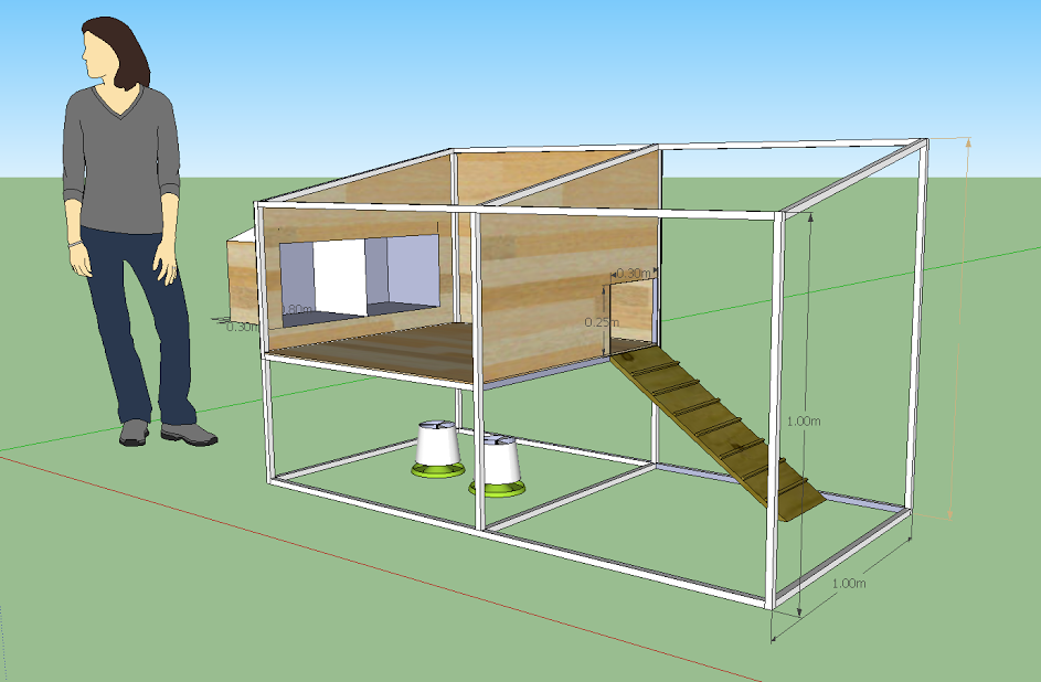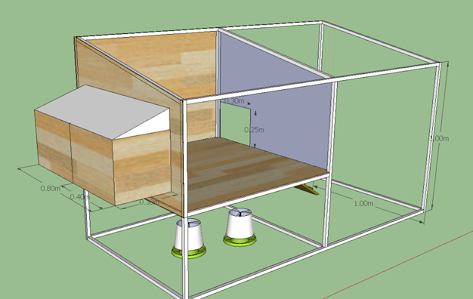 I created a draft design for the new coop. It's 2m wide, 1.2m high and 1m deep. Width is fixed as this is the max width I can make it to fit into the designated spot in the backyard, height and depth can possibly be bigger. I wanted to make the living area high enough so that I can hang the food/water bowl underneath if possible. The ladder is currently placed against the entrance at 34.2 degree angle. Entrance dimensions are 0.3m x 0.25m (width x height). Two nest boxes proposed, dimensions 0.4m wide, 0.3m deep, 0.3m high. Not sure how to design the door mechanism, eventually I want to install automatic door opener.